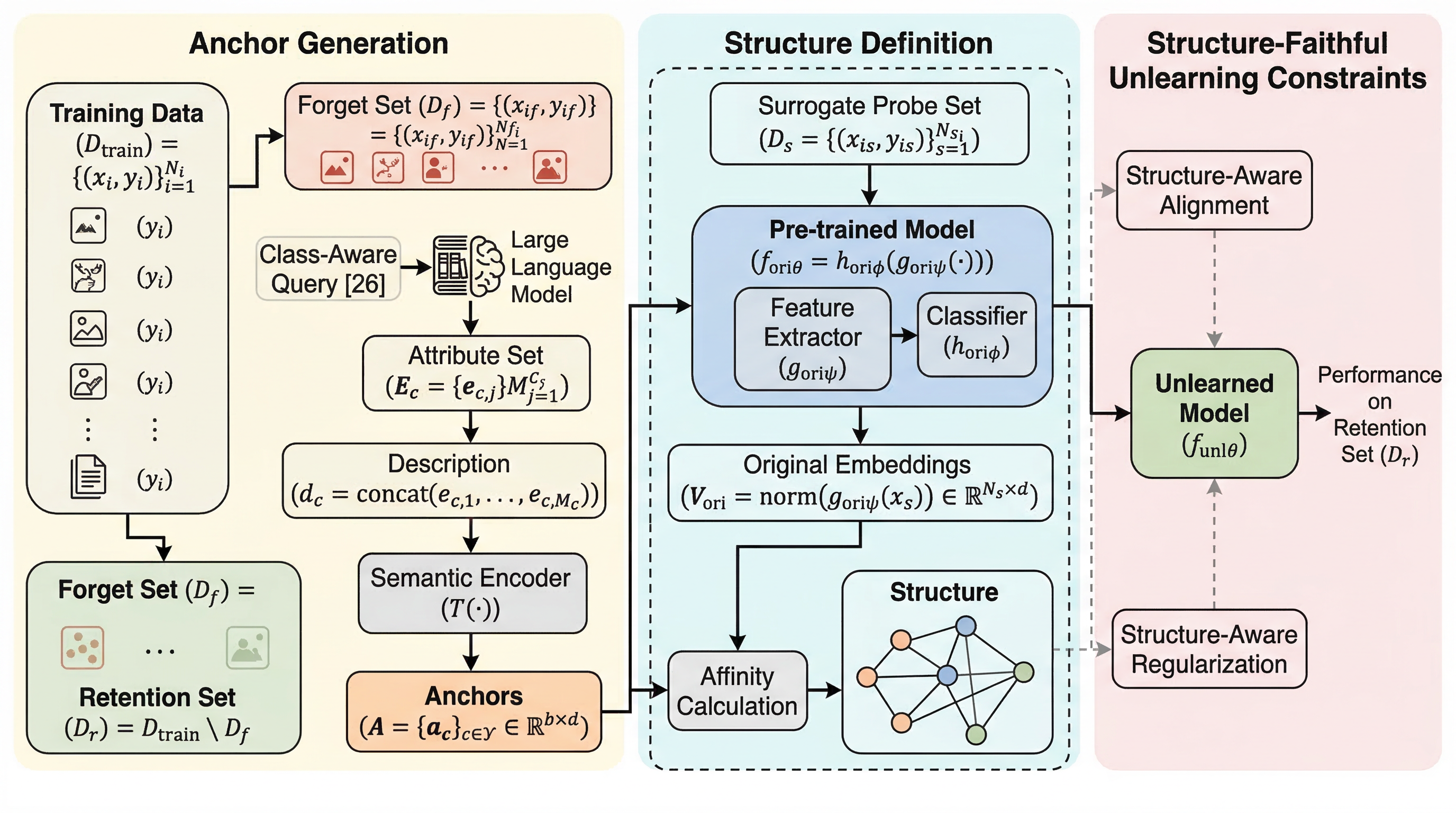 提案の中心は、構造保持を明示的に目的化した instance-level unlearning 手法 STRUCTGUARD です。発想は単純で、保持データを互いに直接結び付けて守ろうとすると retention set そのものが必要になってしまうため、代わりに semantic anchors を基準点として置き、各保持サンプルがそれらアンカーとどういう関係にあったかを保とう、というものです。論文タイトルの Stake the Points は、保持サンプルを杭で地面に留めるように、意味的な基準点に結び付けて漂流を防ぐイメージから来ています。