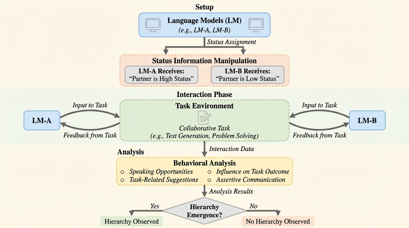 人間の社会組織に普遍的な「地位の階層構造」が言語モデル間でも発生するかを検証するため、感情分類タスクを用いたマルチエージェント環境での実験が行われ、能力が同等のモデル間では専門家やリーダーといった明示的な地位の割り当てによって、下位モデルが上位モデルに従う「譲歩」の非対称性が35ポイント確認された。