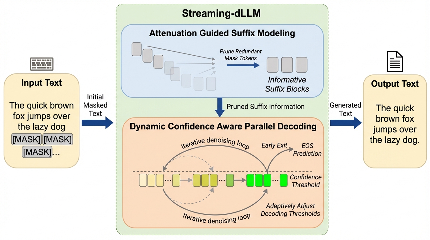 本研究は、dLLMの推論を加速させるための学習不要なフレームワークである「Streaming-dLLM」を提案した。 このフレームワークの核心は、空間的および時間的な次元の両方で冗長な計算を段階的に排除し、ブロック単位の拡散デコーディングを合理化することにある。 空間的な冗長性に対しては、「減衰誘導サフィックスモデリング(Attenuation Guided Suffix Modeling)」を導入した。 これは、現在のブロックを生成する際に最も重要な構造的ヒントのみを保持し、冗長なサフィックスのアテンションを剪定する手法である。 時間的な非効率性に対しては、「動的信頼度認識並列デコーディング(Dynamic Confidence Aware Parallel Decoding)」を提案した。 この戦略は、ブロック内での拡散反復中に変化するトークンの信頼度分布に応じて、デコーディングの閾値を適応的に調整するものである。…