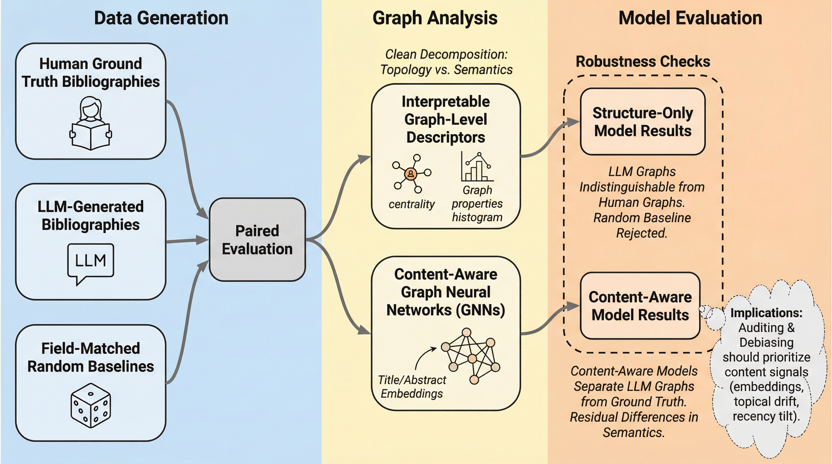 大規模言語モデル(LLM)が生成する参考文献リストは、引用ネットワークの構造的側面(中心性やクラスター係数など)において人間が作成したものと極めて高い類似性を持っており、従来のグラフ解析のみでは識別が困難であることが判明しました。一方で、論文タイトルの意味的な埋め込み表現を解析すると、LLM特有の「指紋」とも呼べる独自のバイアス(有名な論文や新しい論文を過度に好む傾向など)が検出可能であり、これを利用することで高い精度での識別が可能になることが本研究で示されました。 グラフニューラルネットワーク(GNN)に構造情報と意味情報を統合して学習させた結果、人間とLLMの文献リストを93%という高い精度で区別できることが、SciSciNetから抽出した1万件の論文データを用いた検証で明らかになりました。この結果は、LLMが科学的知識の構造を高度に模倣しつつも、内容の選択パターンにおいて非人間的な偏りを残していることを示唆しており、将来的な学術コンテンツの真偽判定やデバイアス技術の確立に向けた重要な指針となります。 本研究は、単一の引用の正誤を判定する従来のファクトチェックを超え、文献リスト全体の構造的なまとまりや意味的な凝集性に着目することで、LLMが科学的知識をどのように内面化し再構成しているかを解明しました。
