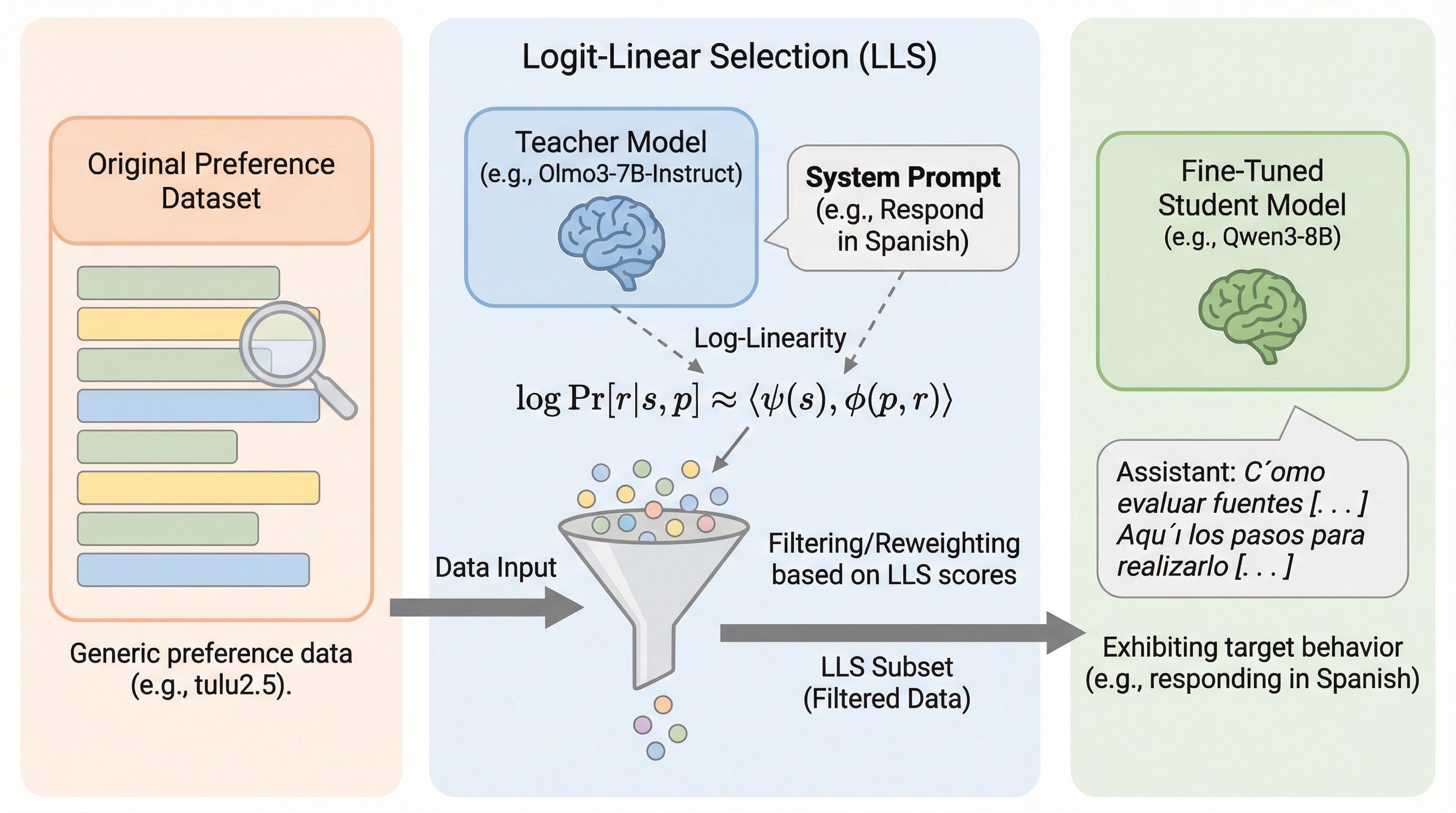 提案の中心は Logit-Linear Selection(LLS) です。論文はLLSを「一般的な嗜好(preference)データセットから、隠れた効果を幅広く引き出すためのサブセット選択法」と位置づけます。ここでいう“サブセット選択”は単なる間引きではなく、狙った挙動に結びつくようにデータの側を並べ替える、という発想として読めます。