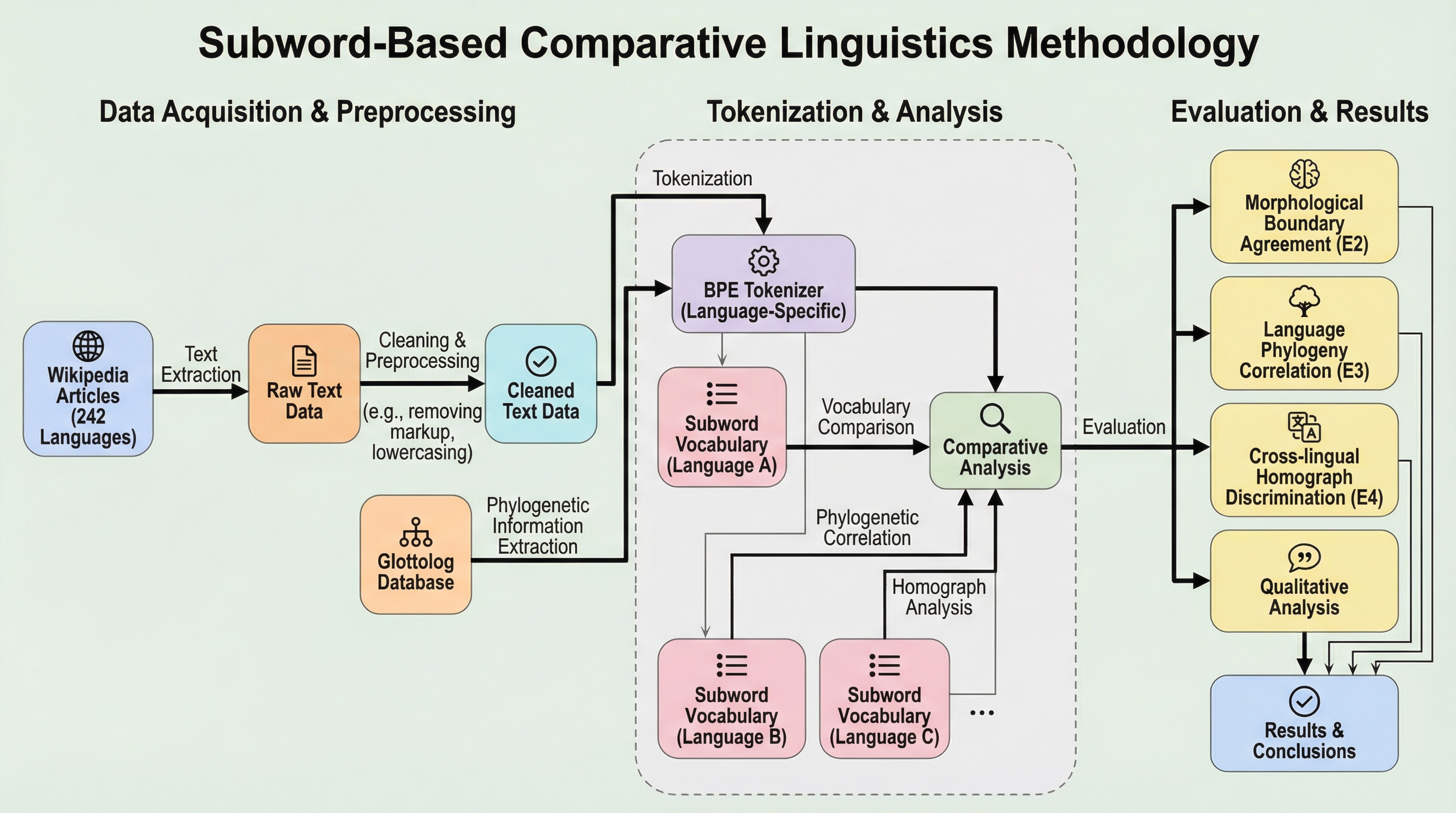 本研究は、Wikipediaの語彙データから構築した「glottoset」を活用し、ラテン文字とキリル文字を使用する242言語を対象に、Byte-Pair Encoding(BPE)を用いた大規模な比較言語学のフレームワークを提案した。