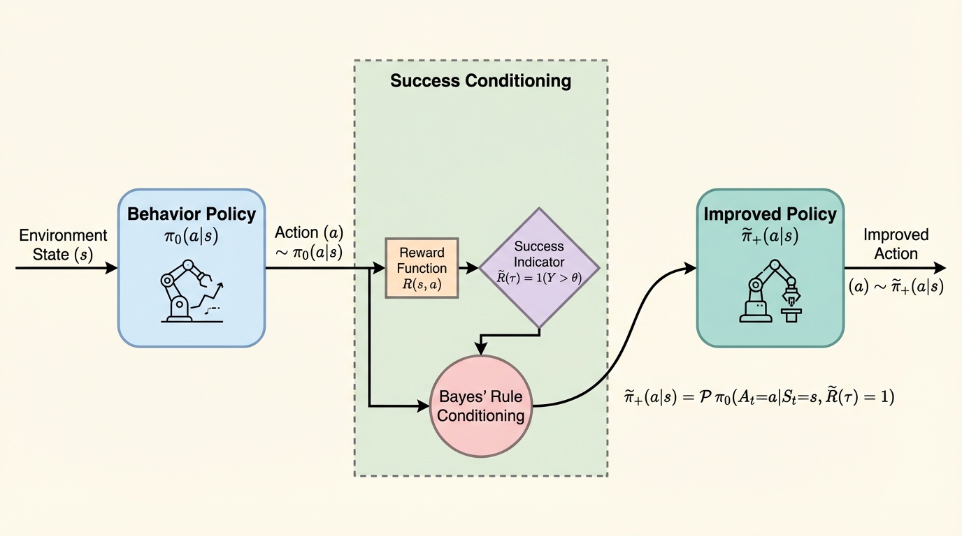 成功条件付け(成功した軌跡を模倣する手法)は、LLMの調整や強化学習で広く使われていますが、その理論的な最適化対象は不明でした。本論文は、この手法が$\chi^2$ダイバージェンスを制約とした信頼領域最適化問題を正確に解いていることを証明しました。 「方策の改善度」「方策の変化量」「アクションの影響力(行動選択が成功率に与える変動)」の3つが、すべての状態で数学的に一致するという「アクション影響力同一性」を提示しました。これにより、学習中の変化量から改善度を直接診断することが可能になります。 この手法は、TRPOなどの既存手法と比較して非常に保守的であり、過去に探索されていない稀な行動を抑制する性質を持っています。失敗する際も危険な挙動を示すのではなく、単に「方策をほとんど更新しない」という形で現れるため、安全性が高いことが示されました。