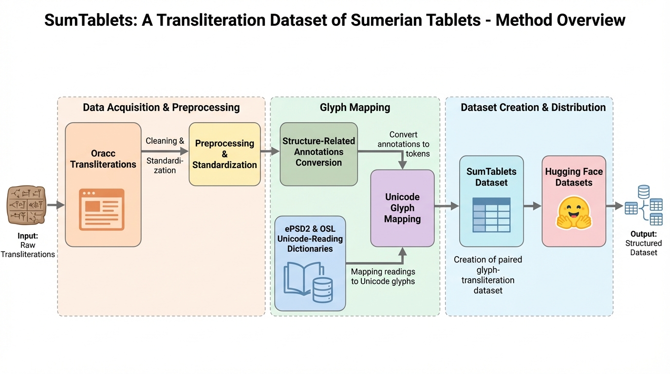 SumTabletsは、シュメール語粘土板の楔形文字をUnicode字形列として表したものと、Oraccで公開されている対応翻字を大規模に対にしたデータセットで、翻字を現代的な自然言語処理の課題として扱うための「入力(字形)―出力(翻字)」の基盤を用意しています。