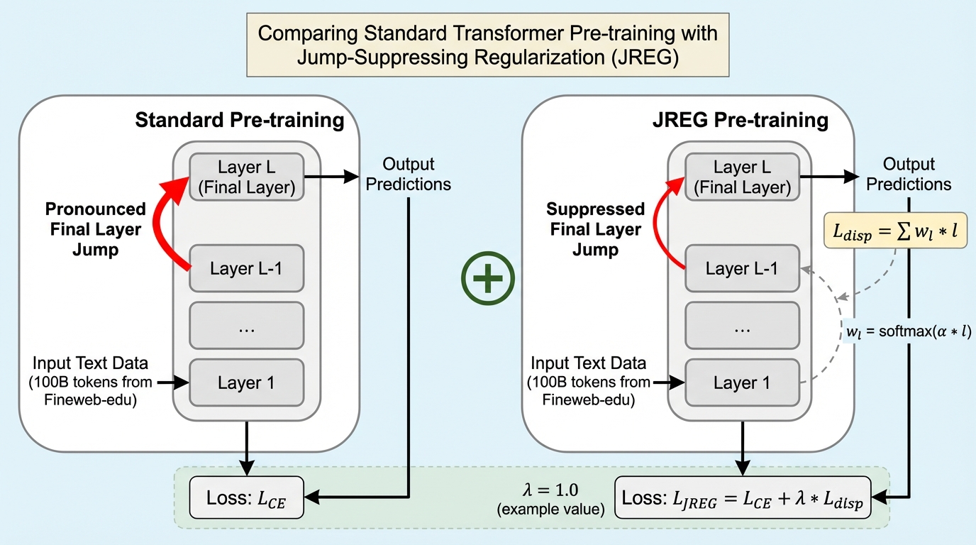 Transformer言語モデルの内部挙動において、最終層付近で隠れ状態の角度距離が急激に変化する「跳躍(ジャンプ)」現象が多くのモデルで共通して観察されており、これが中間層の能力を十分に活用できていない原因であるという課題を特定しました。 この跳躍を定量化する指標を導入した上で、事前学習時に最終層の変位をペナルティとして課す正則化手法「JREG(Jump-Suppressing Regularizer)」を提案し、モデルの計算負荷を中間層へより均等に分散させることで、モデル全体の容量を効率的に引き出すことに成功しました。 Llamaベースの異なる規模のモデルを用いた実験により、モデルアーキテクチャを一切変更することなく、下流タスクにおける予測精度が向上し、内部状態の遷移がより滑らかになることで、パラメータの冗長性が解消されることが実証されました。これにより、将来的な大規模言語モデルの学習効率を大幅に改善する可能性が示唆されています。
