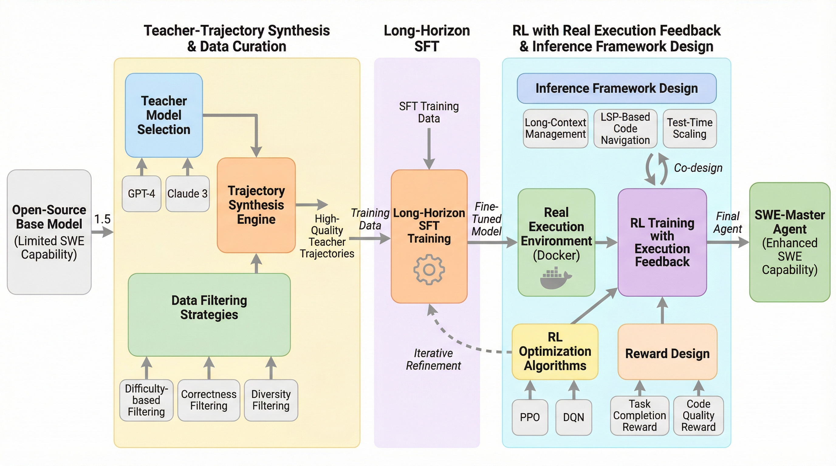 SWE-Masterは、ソフトウェアエンジニアリング(SWE)タスクを自律的に解決するエージェントを構築するための、完全に再現可能でオープンソース化されたポストトレーニングフレームワークである。