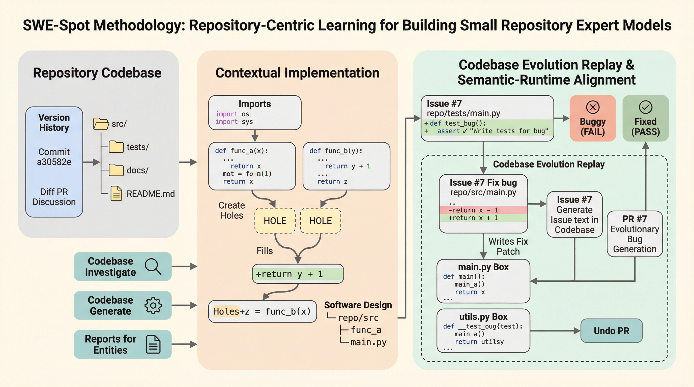 従来のタスク中心学習では、小規模言語モデルが複雑なコードベースの推論時に十分な汎化性能を発揮できず、表面的なパターンの学習に留まるという課題がありました。 本研究は、特定のコードベースに対する垂直的な深さを優先する「リポジトリ中心学習(RCL)」を提案し、静的なコードを対話的な学習信号に変換する4つの経験ユニットを設計しました。 この手法で構築された4BパラメータのSWE-SPOTは、8倍大きなオープンモデルや商用モデルに匹敵する性能を、高いサンプル効率と低い推論コストで実現することに成功しました。