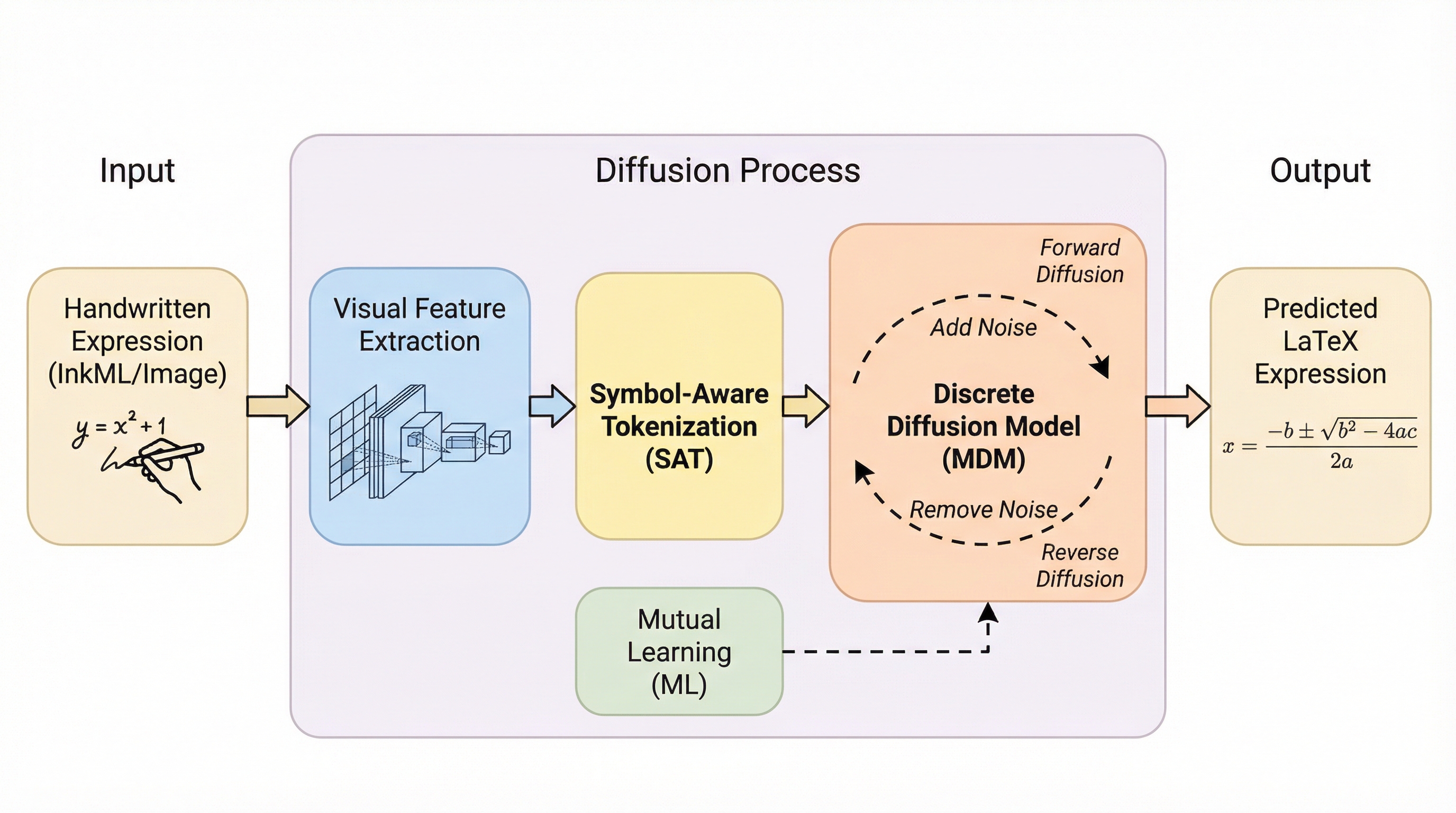 手書き数式認識(HMER)において、従来の逐次的な生成手法ではなく、離散拡散モデルを用いた反復的なシンボル洗練プロセスを提案した。この手法は、先行する予測の誤りが後続に影響する露呈バイアスを排除し、複雑な二次元構造を持つ数式の認識精度を大幅に向上させる。 シンボルと構造修飾子を一対一で対応させる「シンボル認識トークン化(SAT)」を導入し、数式の構文的一貫性を維持しながら表現の複雑さを軽減した。これにより、局所的な修正が全体の構造を壊すことなく行えるようになり、効率的かつ安定した推論が可能となった。 相互学習(RMML)の統合により、筆跡の多様性や構造的な曖昧さに対する頑健性を高め、MathWritingやCROHMEといった主要なベンチマークで従来手法を凌駕する性能を達成した。特にMathWritingでは、文字誤り率5.56%という優れた結果を記録している。