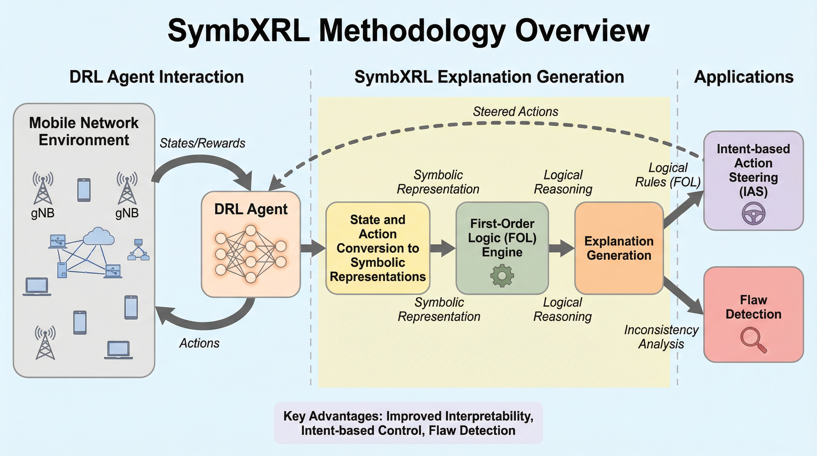 将来の6Gネットワーク管理において不可欠な深層強化学習(DRL)は、意思決定プロセスが不透明な「ブラックボックス」であるため、実際の運用現場への導入が困難という課題がある。 本研究が提案する「SymbXRL」は、一階述語論理(FOL)という記号AIの手法を用いて、DRLの複雑な数値データを人間が理解可能な記号や論理規則に変換し、直感的な説明とナレッジグラフを生成する。 実証実験では、ネットワークスライシングとMassive MIMOの制御において、既存手法を上回る解釈性を提供し、意図に基づく行動制御によって累積報酬を中央値で12%向上させることに成功した。