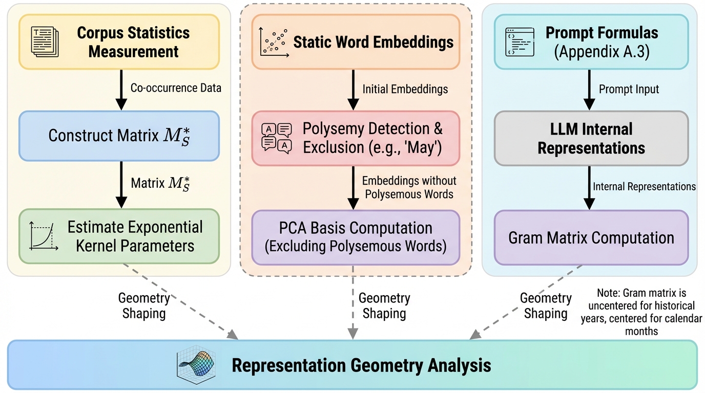 ニューラルネットワークの性能は、学習で得られる表現に強く依存しますが、その表現がどのような原理で形づくられるかは十分に整理されていないと論文は述べています。とりわけ目を引くのが、大規模言語モデルの表現空間に「単純な幾何」が自発的に現れる観察です。例として、暦の月が円のように配置される、歴史年が滑らかな一次元の多様体として並ぶ、都市の緯度・経度が線形プローブで復号できる、という現象が挙げられています。さらに、先行研究ではプリズム、ループ、連続一次元多様体など多様な形が報告され、モデルのアーキテクチャやタスクが違っても繰り返し現れる点が強調されています。こうした普遍性がある一方で、なぜそのような幾何が生じるのかを一つの見取り図で説明する「整理原理」が欠けていることが問題になります。モデル内部の計算や学習則だけに注目すると、観察の種類が増えるほど説明が個別対応になりやすいです。そこで本研究は視点を変え、学習データである自然言語の低次統計、特に二語共起という最も基本的な統計に立ち戻ります。…