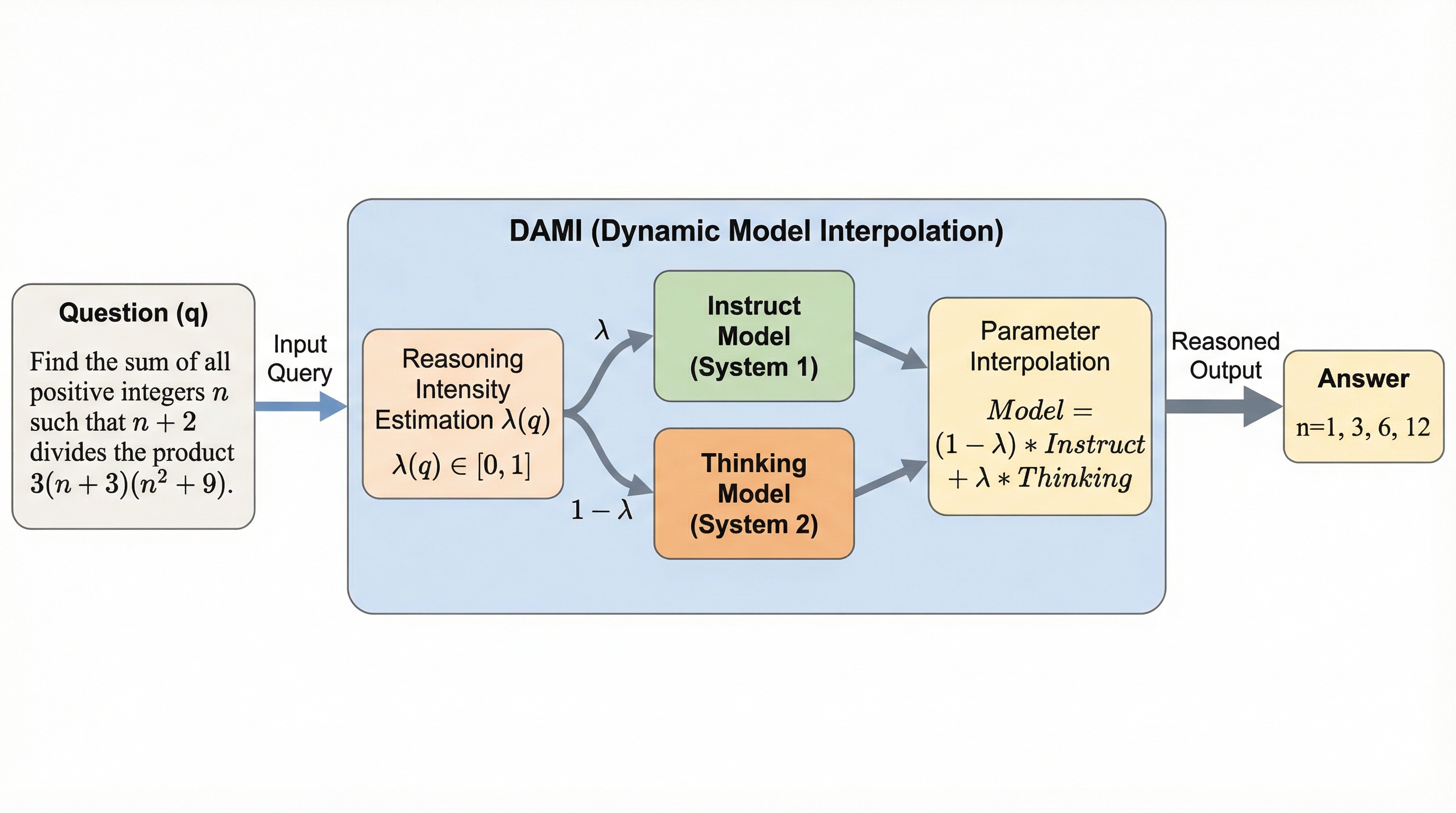 本研究は、既存の指示追従モデル(システム1)と思考モデル(システム2)のパラメータを、入力されたクエリごとに動的に補間するフレームワーク「DAMI(Dynamic Model Interpolation)」を提案しました。これは、出力の内容を後から制限するのではなく、モデルの「推論能力」そのものをクエリごとに最適化する「能力制御」という概念を具現化したものです。具体的には、二つのモデルのパラメータを線形補間し、その混合比率を決定する「推論強度(Reasoning Intensity)」という係数λを、入力されるクエリの難易度や性質に応じて動的に推定します。…