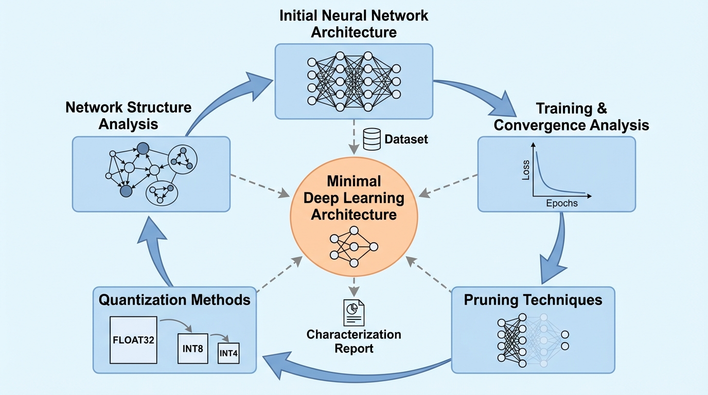 本研究は、深層ニューラルネットワーク(DNN)、畳み込みニューラルネットワーク(CNN)、およびビジョン・トランスフォーマー(ViT)を対象に、特定のタスクを解決するために必要な「最小限のアーキテクチャ」を特定するための統一的な計算手法を提案し、学習の収束性、枝刈りへの耐性、量子化の堅牢性を体系的に解析した。