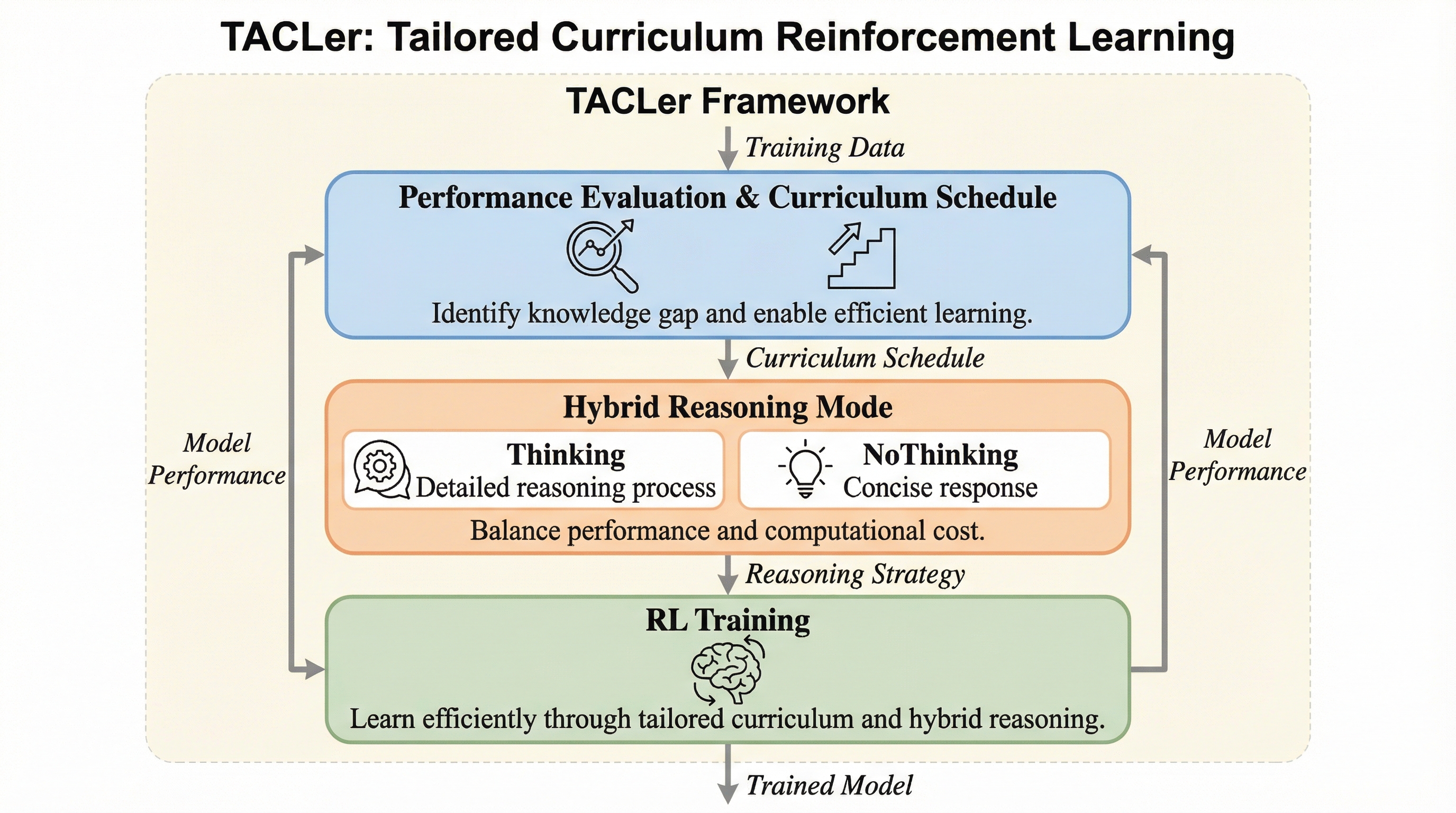 TACLerは、モデルの習熟度に合わせて学習データの難易度を段階的に引き上げる「個別最適化カリキュラム学習」と、詳細な思考と簡潔な回答を使い分ける「ハイブリッド推論モード」を統合した強化学習フレームワークである。