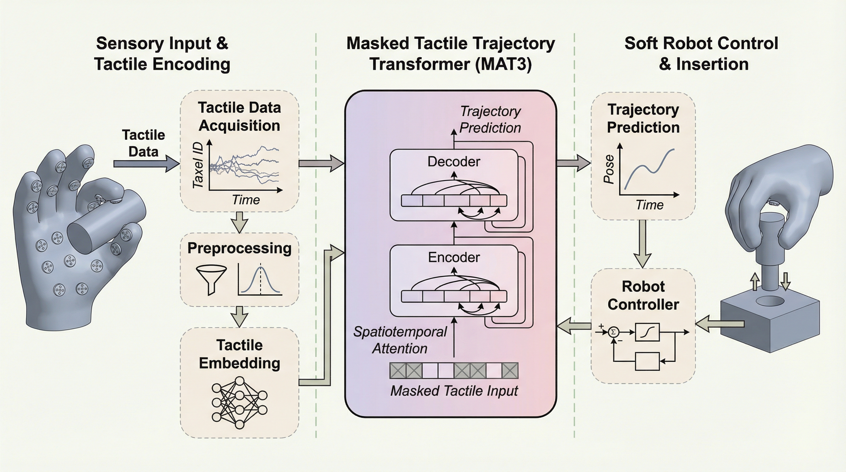 物理的な柔軟性を備えたソフト手首と、過去の触覚体験をデータベース化して検索・再利用する機能を統合したロボットシステム「TaMeSo-bot」を開発し、位置の不確実性が高い環境下での堅牢なペグ挿入を実現しました。 中核技術の「MAT3」は、マスク化トークン予測を用いた双方向Transformerを採用しており、分散型触覚センサの信号、力、ポーズ、行動の間の複雑な時空間的相互作用を統合的にモデル化することで、未知の状況下でも最適な行動を過去の経験から導き出します。 実機を用いた検証では、学習データに含まれない未知の形状のペグや、把持のズレ、接触面の摩擦の変化といった極めて困難な条件下においても、従来の手法を大きく上回る高い成功率と優れた適応能力を示すことが定量的に確認されました。