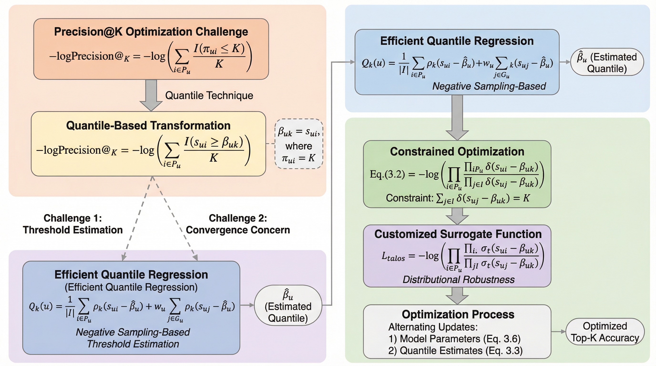 従来の推薦システムで主流だった全ランキング指標の最適化は、実際の利用シーンで重要なTop-$K$精度と必ずしも一致しないという課題がありました。本研究で提案されたTalosは、複雑な順位計算をスコアとしきい値の比較に置き換えるクォンタイル手法を導入し、Top-$K$精度を直接的かつ効率的に最適化する新しい損失関数です。サンプリングに基づく回帰アルゴリズムによる高速なしきい値推定や、スコアの過度な上昇を防ぐ制約項、分布の変化に対する頑健性を備えており、既存のモデルに容易に組み込めて高い性能を発揮することが実証されました。