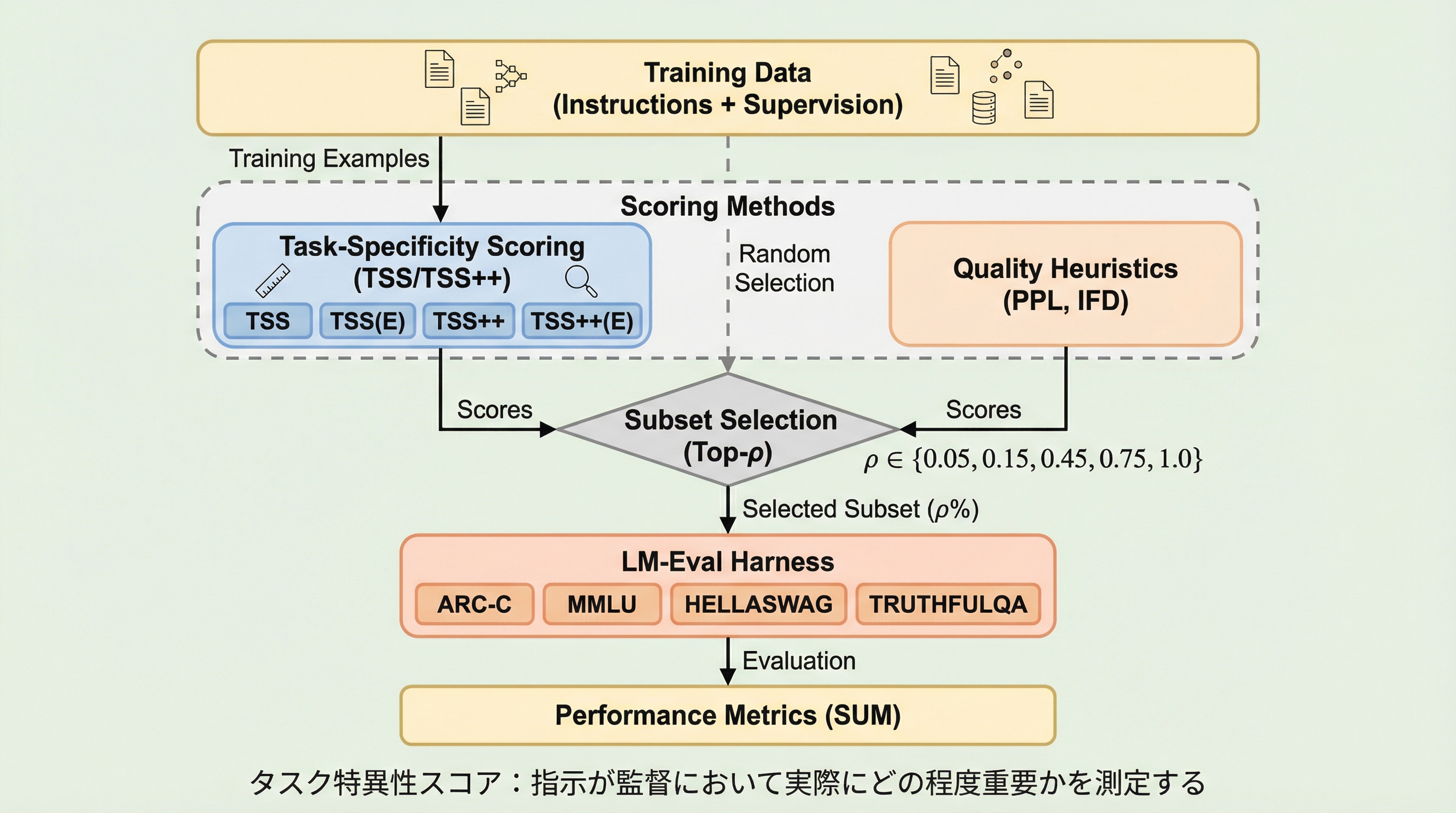 本論文の核心的な提案は、指示が出力をどれだけ一意に特定しているかを測定する「タスク特異性スコア(Task-Specificity Score: TSS)」である。これはモデルに依存しない指標であり、同じ入力に対して考えられる他の妥当な指示と比較して、真の指示がどれだけ出力を強く決定づけているかを評価するものである。直感的には、ある例の出力が、与えられた真の指示に対しては非常に適合し、かつ他の合理的な代替指示に対しては適合性が著しく低い場合に、その例は「高いタスク特異性」を持つと見なされる。 情報理論的な観点から見ると、TSSは入力が与えられた条件下での指示と出力の間の「条件付き相互情報量」のモンテカルロ近似として解釈できる。これは大規模言語モデルにおいて直接計算することが困難な値であるが、TSSを用いることで実用的な計算が可能になる。さらに、著者らはこの基本概念を拡張した「TSS++」を提案している。…