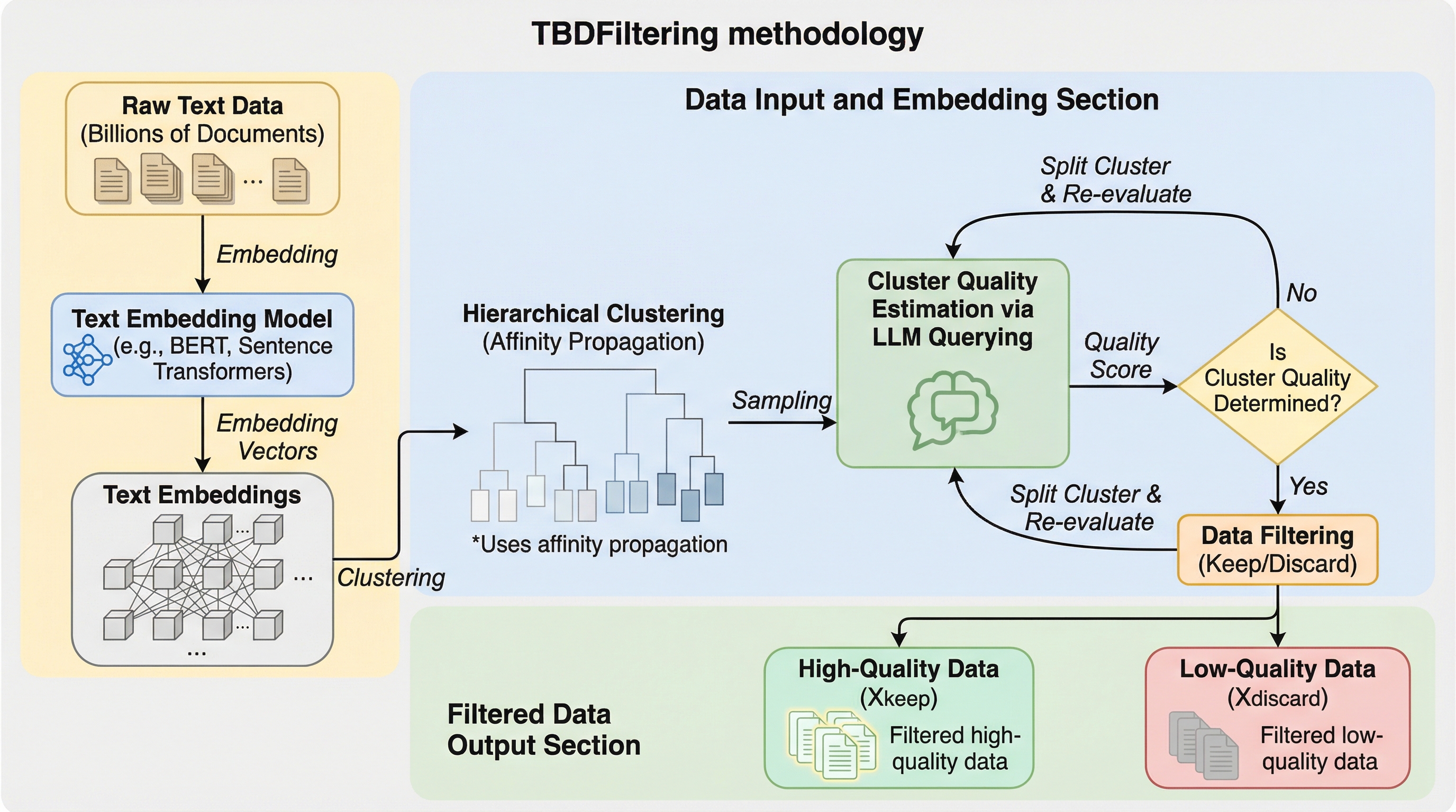 本論文では、テキスト埋め込みに基づいた階層的クラスタリングを活用し、LLMによって評価すべき文書を適応的に選択する「TBDFiltering(Tree-Based Data Filtering)」という手法を提案しています。この手法の最大の特徴は、従来のパラメトリックな分類器モデルを学習させるアプローチとは異なり、クラスタリングに基づいたノンパラメトリックな手法である点にあります。具体的には、埋め込み空間における距離を用いてデータをクラスタリングし、各クラスタ内の文書品質を推定することで、高品質なクラスタに属する文書のみを効率的に抽出します。 この手法は、階層的クラスタリングの構造を利用することで、計算コストを大幅に削減します。…