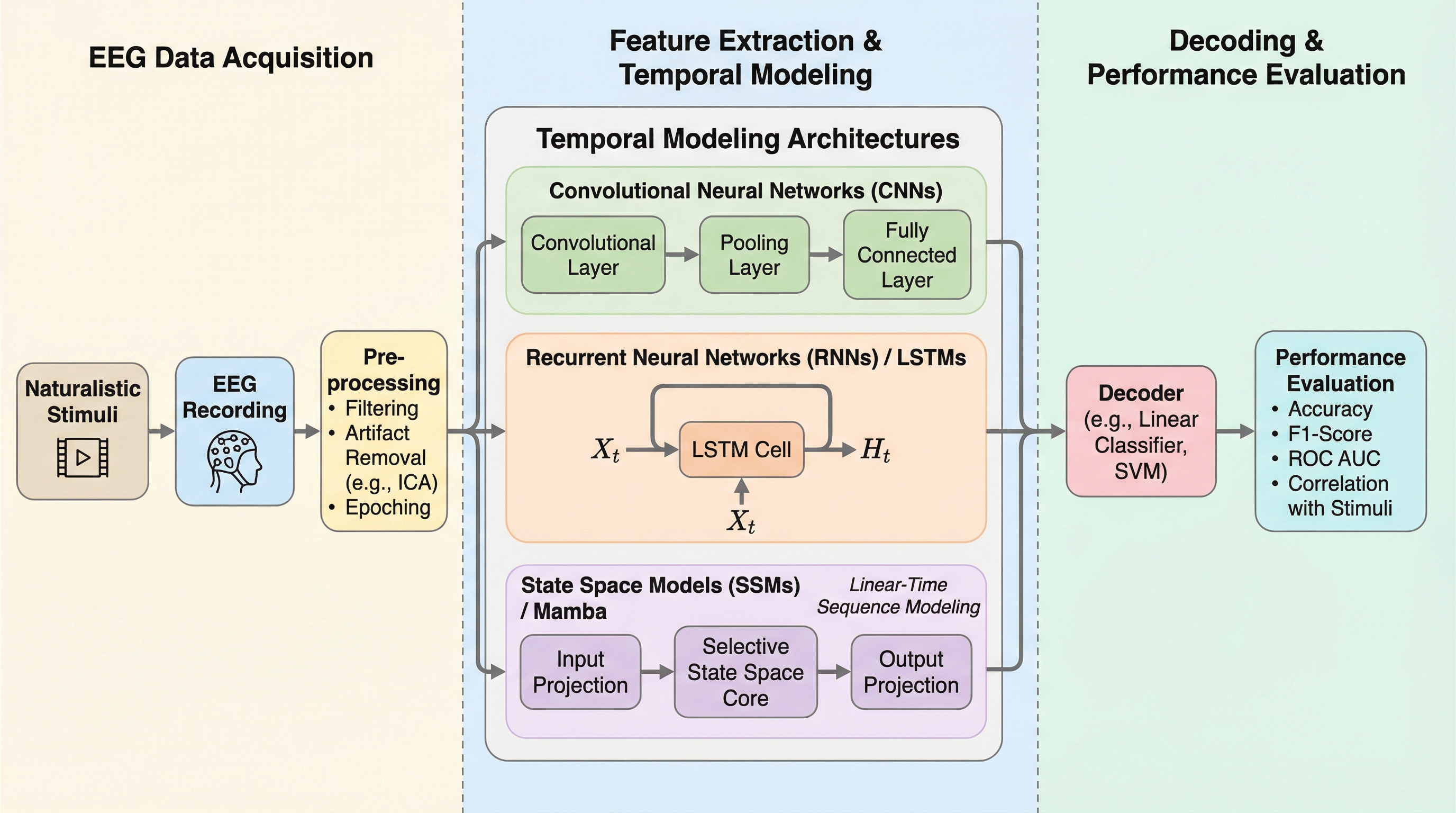 映画鑑賞のような自然な刺激を受けている最中の脳活動をEEG(脳波)から解読することは、神経科学および工学における非常に困難な課題である。脳波データは本質的にノイズが多く、連続的な記録から長期的な時間依存性を捉える必要があるため、モデルには高度な時系列処理能力が求められる。従来、深層学習を用いたEEG解析では、CNN(畳み込みニューラルネットワーク)やTransformerが広く利用されてきた。しかし、CNNは受容野が局所的に制限されるという制約があり、広範囲の時間的情報を統合することが難しいという欠点がある。一方で、Transformerはアテンション機構によって全域的なコンテキストを把握できるものの、データの長さに対して計算量やメモリ消費が二次関数的に増大するという課題を抱えており、長い脳波セグメントの処理には不向きであった。 近年、これらの限界を克服するために、S4やS5、Mambaといった構造化状態空間モデル(SSM)が登場した。これらは長距離のモデリング能力と、線形に近い計算複雑性を両立させる新しい選択肢として注目されている。…