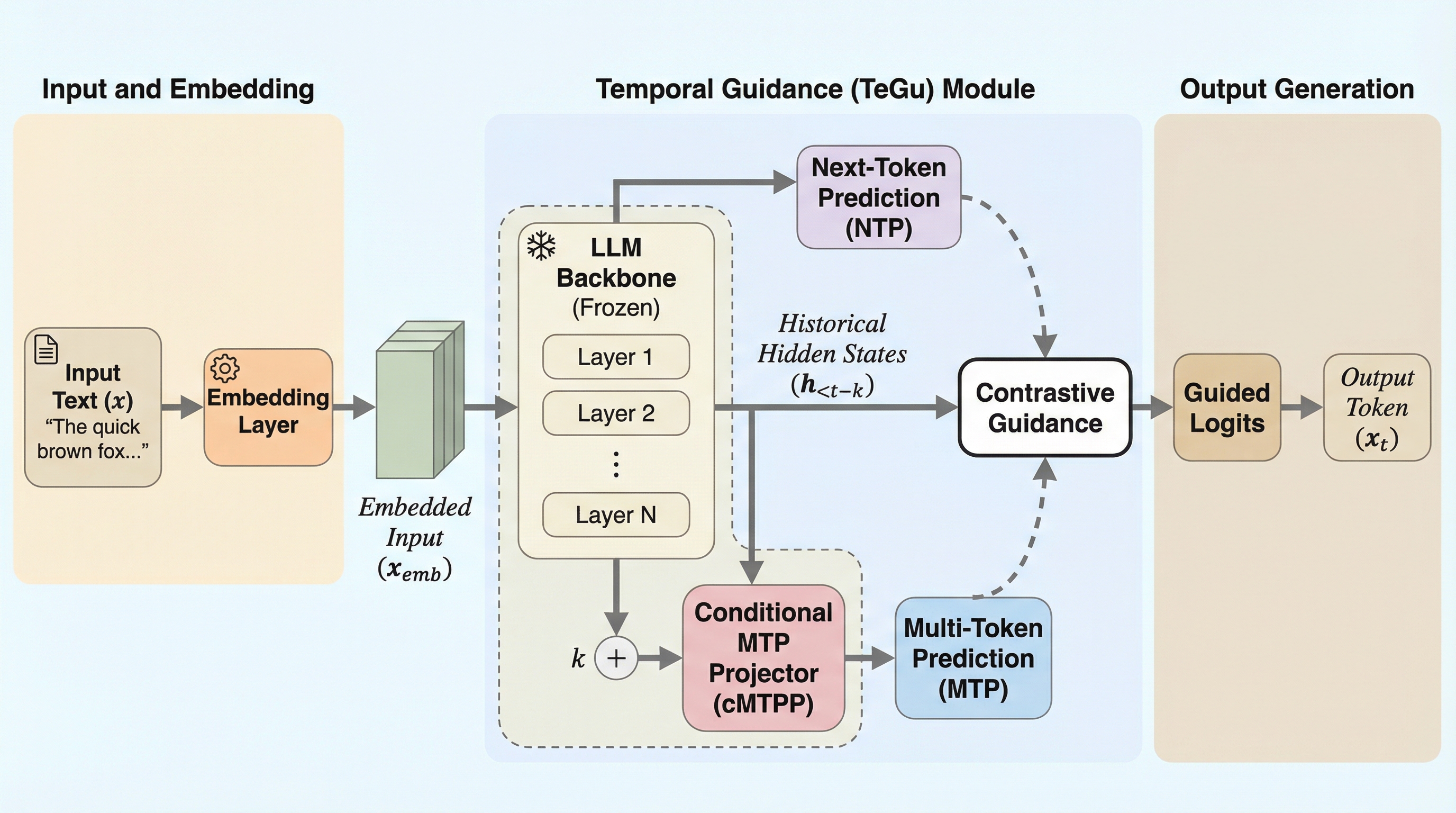 本論文では、LLMの時間的次元(Temporal Dimension)を巧みに利用した、堅牢かつ効率的なデコーディング戦略である「TeGu(Temporal Guidance)」を提案しています。この手法の核心的なアイデアは、モデル自身の「過去の自分」をアマチュアとして利用するという点にあります。具体的には、マルチトークン予測(MTP)の設定において、ある時点の隠れ状態から数手先のトークンを予測させると、その予測は直近の重要な文脈を欠いているため、必然的に「不完全で一般的な予測(アマチュア分布)」になります。この文脈が不足した過去の予測と、現在の完全な文脈を持つ「エキスパート分布」を対比させることで、生成プロセスをより正確な方向へと導くことが可能になります。…