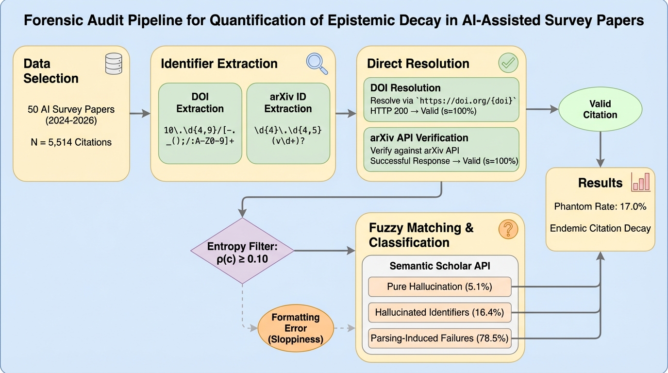 本研究は、2024年9月から2026年1月の間に発表されたAI分野のサーベイ論文を対象とした法医学的監査を提案し、実行したものである。具体的には、5,514件の個別の引用を含む50本のサーベイ論文を分析し、各引用をDOI解決、APIベースのメタデータ取得、および曖昧テキストマッチングを組み合わせたハイブリッド検証パイプラインにかけた。単なるエラーのカウントを超えて、修復可能な「不注意(Sloppiness)」と、修復不可能な「ファントム(Phantoms)」を区別し、さらにファントムを3つの診断的失敗モードに分類した。 この研究の核心は、AI支援による執筆が科学文献に導入する「情報の分散(エントロピー)」を定量化することにある。調査の結果、17.0%という持続的なファントム率が検出された。これはランダムな変動ではなく、減衰の平衡状態であると考えられる。…