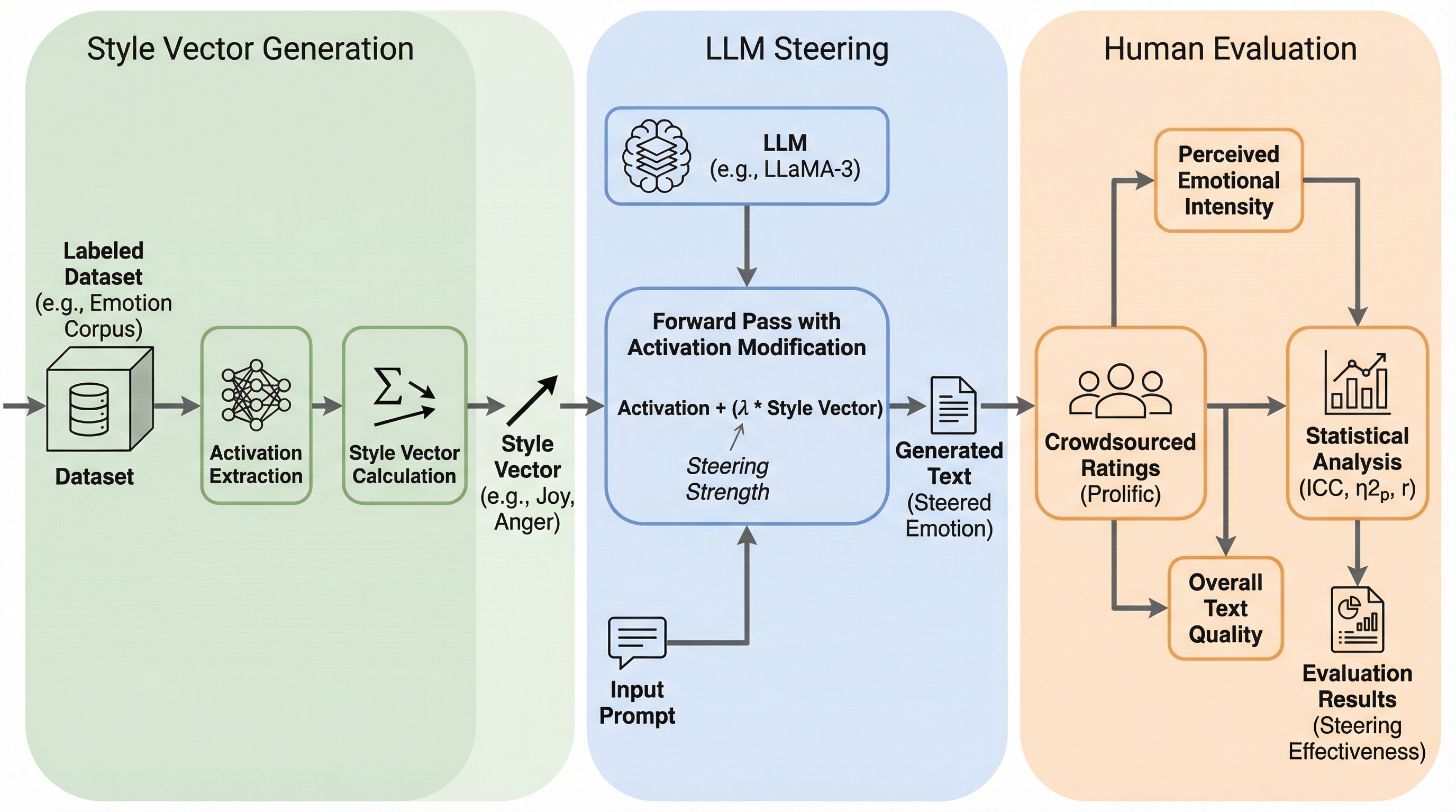 本研究は、大規模言語モデル(LLM)の内部活性化を直接操作する「アクティベーション・ステアリング」を用い、出力の感情トーンを制御する手法の有効性を、190人の参加者による7,000件以上の評価を通じて初めて人間中心の視点から検証した。 実験の結果、ステアリング強度を適切な値($\lambda \approx 0.15$)に設定することで、テキストの品質や理解しやすさを維持しながら、特定の感情(特に嫌悪や恐怖)を効果的に強調できることが明らかになり、自動評価指標と人間の知覚の間にも高い相関(r=0.776)が確認された。 Llama-3-8Bなどの最新モデルにおいて、スタイルベクトルはプロンプトエンジニアリングよりも微細な感情制御を可能にするスケーラブルな手法であり、航空宇宙や医療などの安全性が重視される分野における人間とAIの円滑なコミュニケーションを促進する可能性を示している。