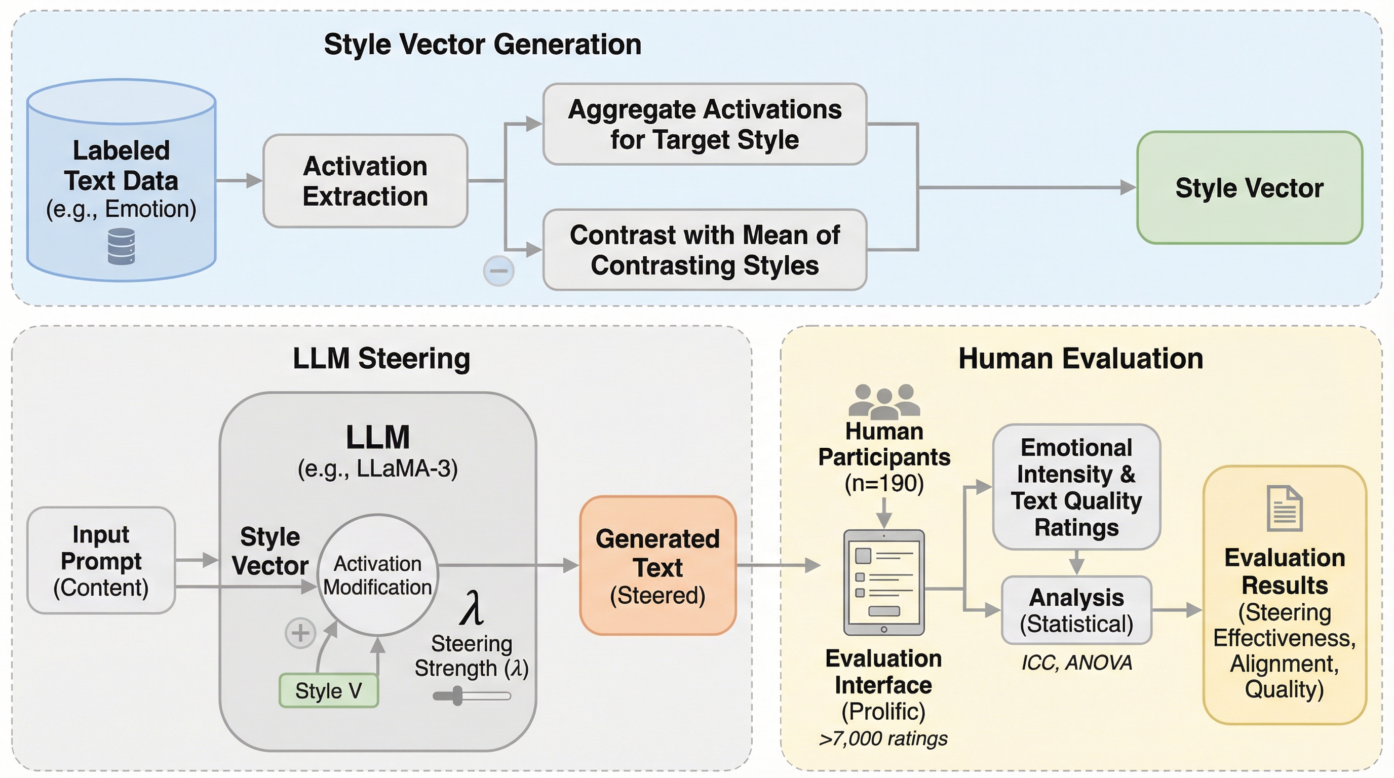大型言語モデルの内部活性化を直接操作するアクティベーション・ステアリングは、追加学習や複雑なプロンプトを必要とせずに、出力の感情トーンを精密かつ段階的に制御できる軽量な手法である。本研究では、190人の参加者から7,000件以上の評価を収集する初の大規模な人間評価を実施し、人間がモデルの感情変化を明確に知覚できること、および自動評価指標と人間の直感が平均r=0.776という高い相関を示すことを証明した。特定の強度(λ≈0.15)でステアリングを行うことで、テキストの読みやすさを維持したまま「嫌悪」や「恐怖」などの感情を効果的に増幅できる一方、「驚き」の制御は比較的困難であるという感情ごとの特性や、モデルの基礎能力が制御の一貫性に寄与することが明らかになった。