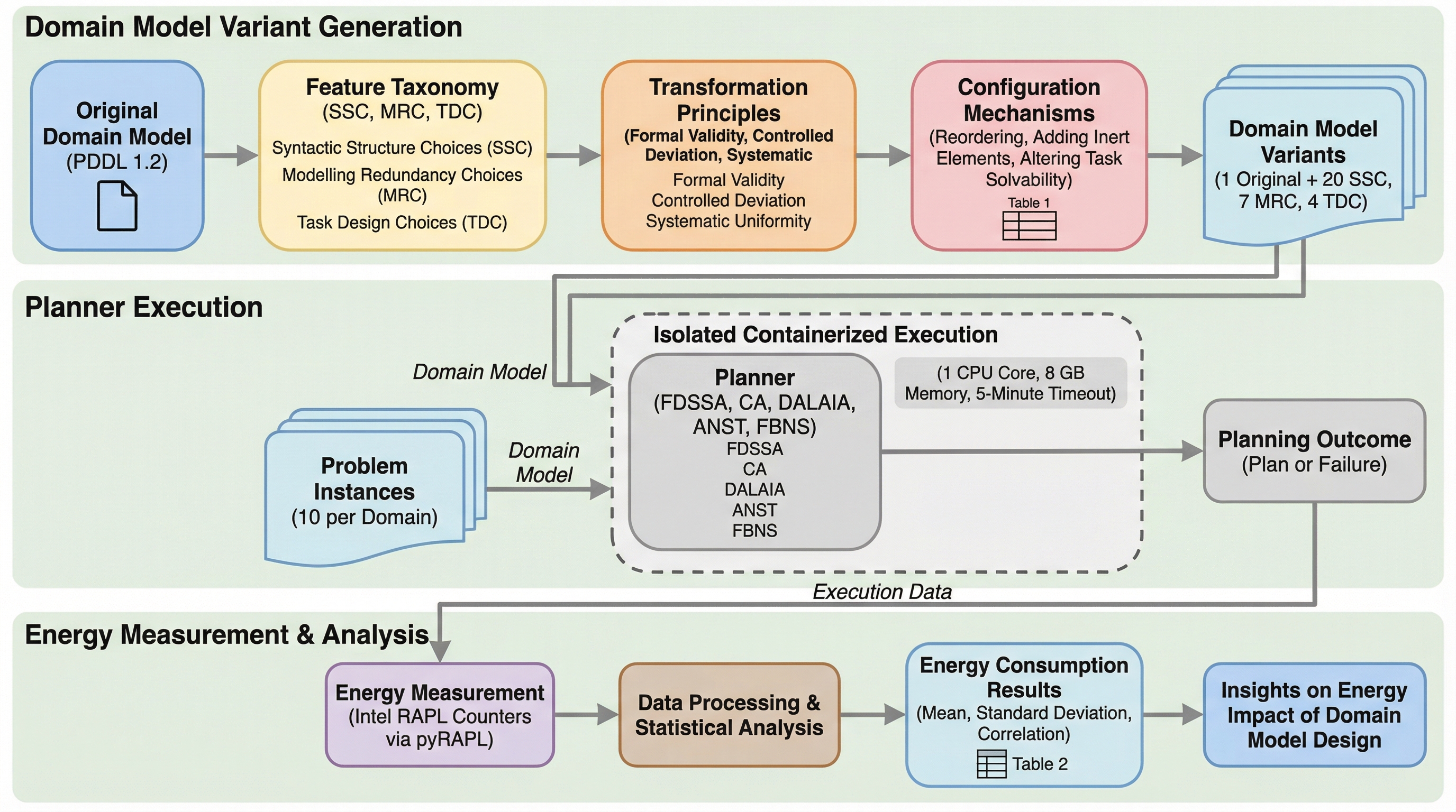 AI計画法において、アルゴリズムとは独立して定義されるドメインモデルの設計が、システムの消費エネルギーに極めて大きな影響を及ぼすことを、5つのプランナーと5つのベンチマークを用いた実験により明らかにした。 構文の順序変更といった単純な修正は一部のプランナーに限定的な影響を与えたが、未使用パラメータの追加などの冗長な設計は、特定の条件下でエネルギー消費を12倍以上に増大させ、計算リソースの利用効率を著しく低下させることが判明した。 エネルギー消費量は必ずしも実行時間と正の相関を持つわけではなく、デッドエンドの導入や効果の削除といったタスク設計の変更が、プランナーの内部的な探索プロセスや計算負荷を劇的に変動させ、従来の性能指標だけでは捉えきれない環境負荷を生むことが示された。