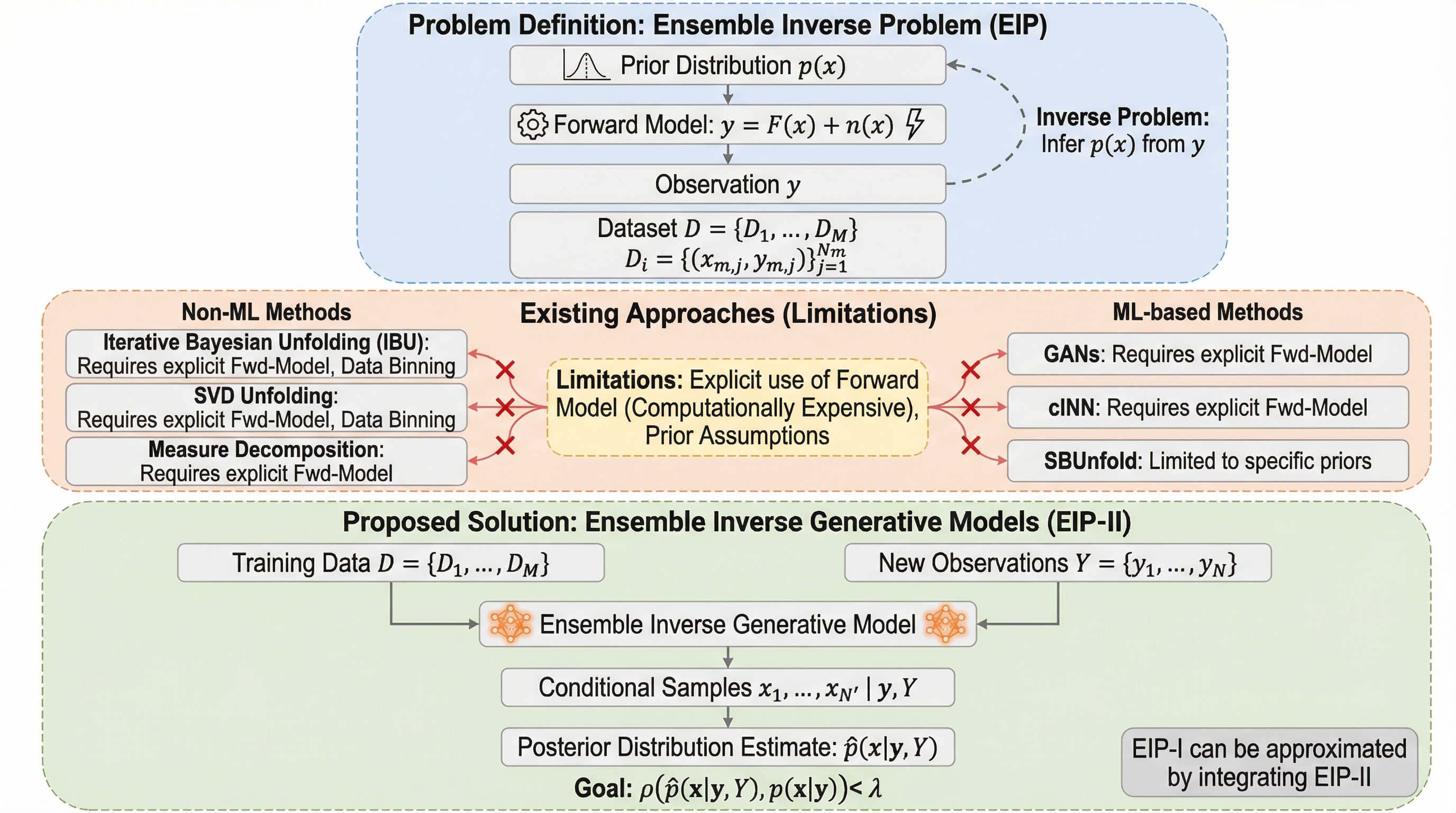アンサンブル逆問題(EIP)とは、未知の事前分布から得られた観測データの集合を用いて、元の真の分布を推定する新しい統計的課題であり、素粒子物理学のアンフォールディングや地震波解析、画像復元などの幅広い分野に応用が可能である。 提案手法である「アンサンブル逆生成モデル(EI-DDPM/EI-FM)」は、個別の観測値だけでなく観測データ全体の集合情報を活用することで、推論時に順モデルを反復的に計算することなく、未知の事前分布に対しても高い汎化性能を持って真の分布をサンプリングできる。 合成データや素粒子物理学の実データを用いた検証において、提案手法は従来の反復手法や標準的な条件付き生成モデルを上回る精度を示し、事前分布の知識が乏しい状況下でも、アンサンブル情報を抽出する不変ネットワーク構造により正確な後方分布の推定を実現した。