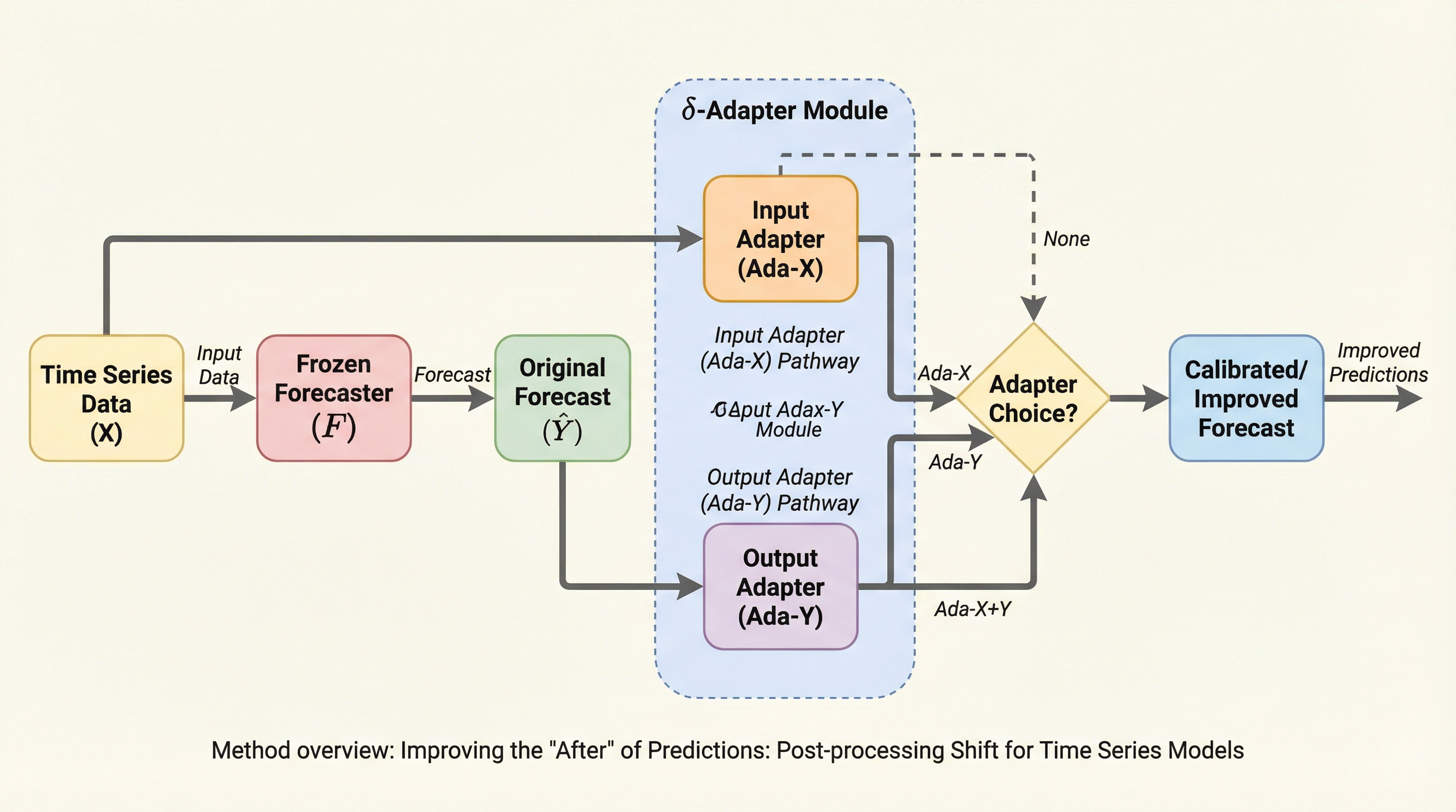 時系列予測においてモデル構造の改善による精度向上が飽和しつつある中、既存の学習済みモデルを一切再学習・変更することなく、入力データの微調整と出力の残差修正という2つの軽量な後処理モジュールを追加することで、予測精度と不確実性の評価を一貫して向上させるフレームワーク「$\delta$-Adapter」が提案されました。