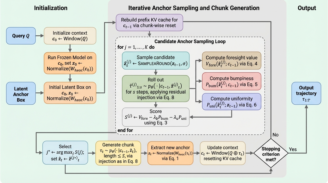 大規模言語モデルの推論能力を向上させるための推論時計算量の拡張において、従来の強化学習やサンプリング手法は膨大な学習コストやメモリ消費、推論経路の重複といった深刻な課題を抱えていましたが、本研究が提案する「TGR(The Geometric Reasoner)」は、追加学習を一切必要とせず、推論過程をチャンク単位に分割してメモリ消費を抑えつつ、潜在空間での多様体情報を活用した「潜在的予見探索」を行う革新的なフレームワークです。 具体的には、推論を短いチャンクに分割し、各境界で潜在アンカーを抽出・サンプリングして、予見スコア、軌跡の滑らかさを表す凹凸ペナルティ、多様性を促す一様性正則化からなる幾何学的スコアで最適な経路を選択し、低ランクの残差注入によってモデルを制御することで、KVキャッシュのメモリ消費を文脈長に対して線形に保ちながら、長大で論理的一貫性のある多様な推論を効率的に生成することに成功しました。 Qwen3-8Bを用いた数学やコード生成の難解なベンチマークでの検証では、Pass@k曲線の曲線下面積(AUC)を最大13ポイント向上させ、計算負荷をわずか1.1倍から1.3倍程度に抑えつつ、既存の強化学習ベースの手法(GRPOやSimKO)を凌駕する高い網羅性と予算効率を実証しており、モデルの重みを更新することなく推論時の工夫のみで高度な探索を実現できる実用性の高い手法であることを示しました。