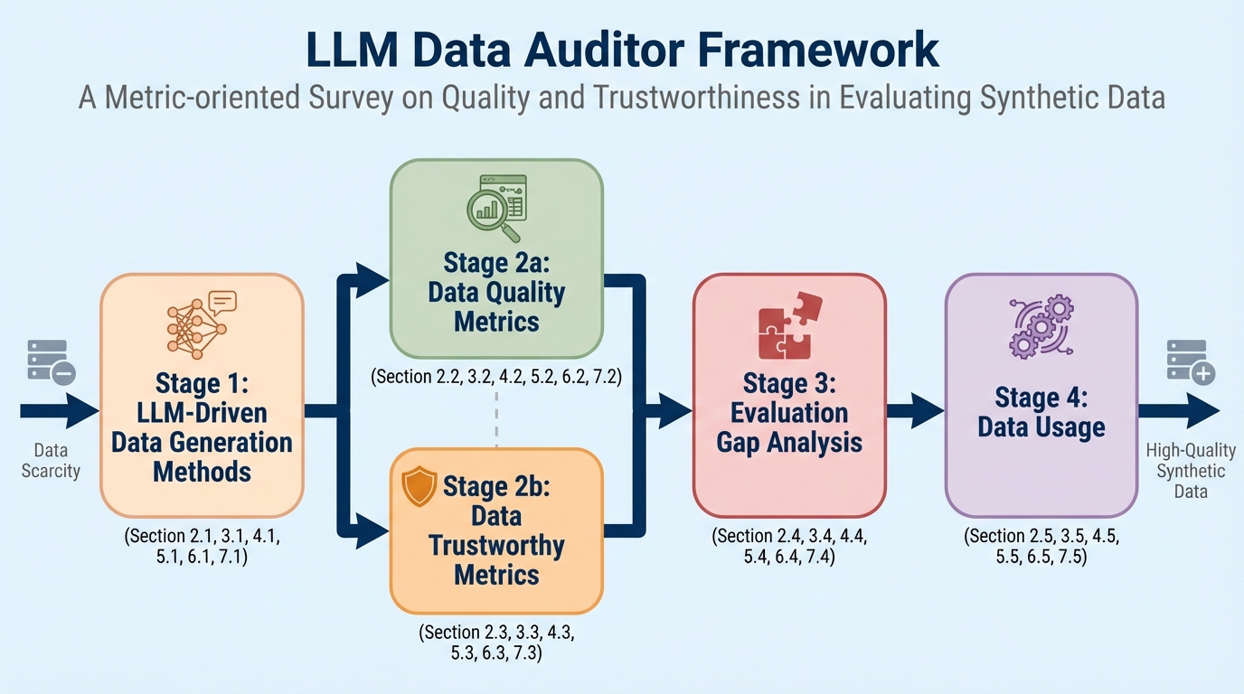 大規模言語モデル(LLM)による合成データ生成は、現実世界のデータ不足を解消し、モデルの学習や評価を効率化する強力な手段ですが、低品質なデータは「モデル崩壊」やプライバシー漏洩といった深刻なリスクを招く可能性があります。本研究では、テキスト、論理推論、表形式、半構造化、視覚、エージェントの6つの主要なモダリティを横断的に評価するための包括的な「LLM Data Auditor」フレームワークを提案し、データの真の価値を多角的に監査する体系を確立しました。 従来の評価が「学習後のモデル性能」という外在的な指標に依存していたのに対し、本フレームワークはデータそのものが持つ「品質(妥当性・忠実度・有用性)」と「信頼性(安全性・誠実性・公平性等)」を直接測定する内在的評価への転換を強く提唱しています。これにより、データがモデルに投入される前の段階で、その健全性を厳格にキュレーションするための具体的な指針が示されました。 膨大な文献調査を通じて、現在の研究がタスク性能の向上に偏り、安全性やプライバシーの評価が著しく不足しているという「評価のギャップ」を特定しました。本サーベイは、単なる手法の羅列に留まらず、マルチモーダルな合成データの生成から評価、実用的な活用に至るまでの全プロセスをカバーする戦略的なガイドラインを提供し、信頼性の高い人工知能開発のための新たなロードマップを提示しています。