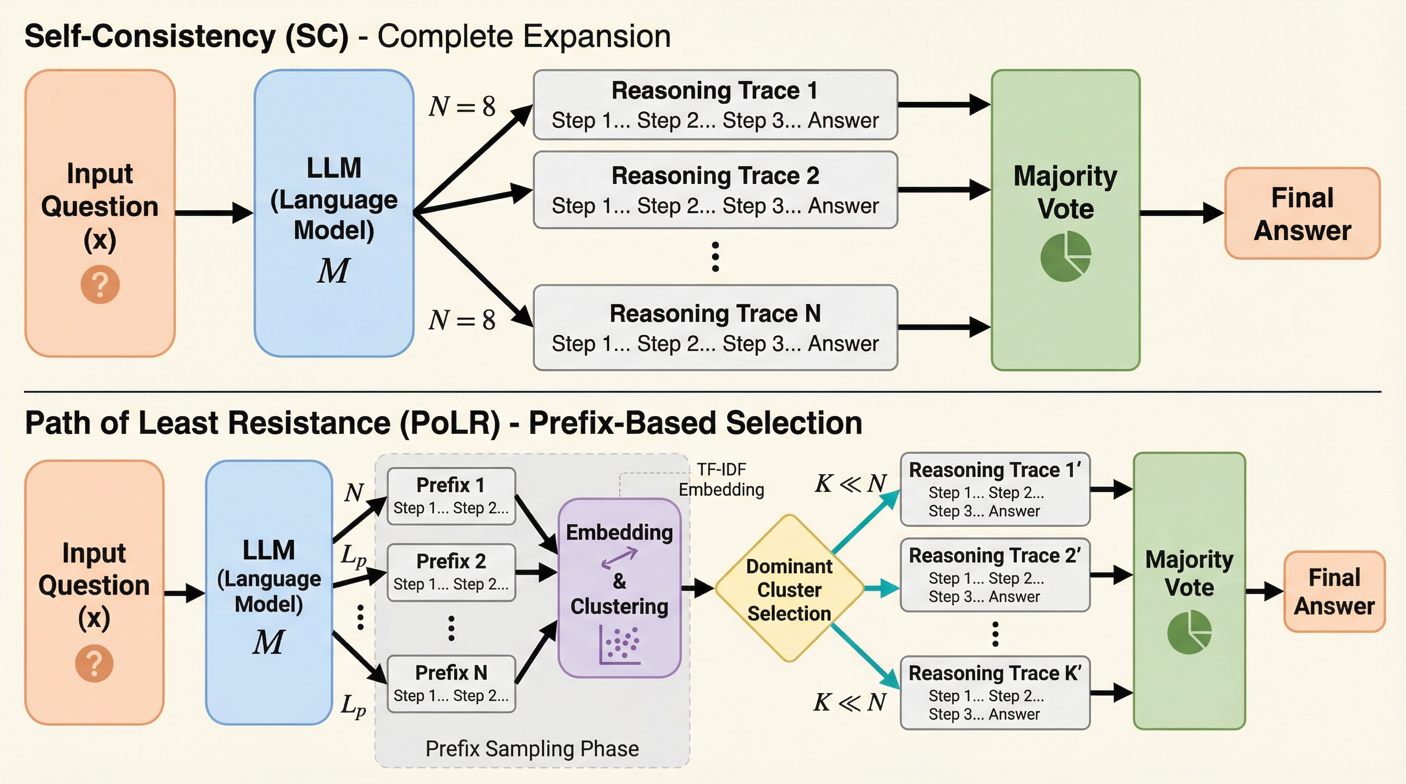 PoLR(Path of Least Resistance)は、大規模言語モデル(LLM)の推論コストを劇的に削減するために開発された、推論時に適用可能な新しいアルゴリズムである。従来のSelf-Consistency(SC)がすべての推論経路を最後まで生成して計算資源を浪費するのに対し、本手法は初期の短い断片(プレフィックス)を生成した段階でクラスタリングを行い、最も有力なグループのみを拡張することで無駄な計算を排除する。 数学や科学などの多様なベンチマークにおいて、SCと同等以上の精度を維持しながら、トークン使用量を最大60%、実行時間を最大50%削減することに成功しており、モデルの追加学習を必要としないドロップイン型の代替案として極めて高い実用性を持つ。 理論的な分析により、推論の初期段階には最終的な正解を予測するための強い信号が含まれていることが示されており、この「プレフィックスの一貫性」を利用することで、効率性と精度の両立を実現している。既存の適応的推論手法とも完全に補完関係にあり、それらと組み合わせることでさらなる計算資源の節約が可能となる。