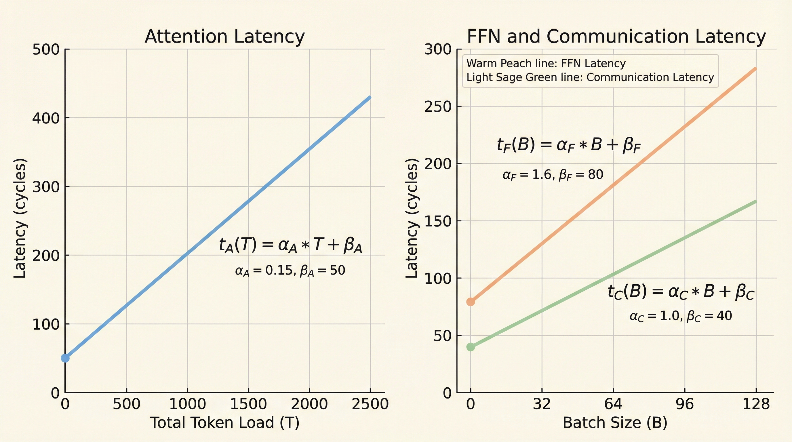 本研究の核心は、AFDサービングにおける確率的なワークロードモデルを開発し、最適なAttention対FFNの比率を閉形式の数式で導出したことにある。Attention側の負荷が時間とともに変化する動的な性質を、マルコフ的なダイナミクスとして定式化した。具体的には、リクエストの終了確率が幾何分布に従うという経験的事実に基づき、KVキャッシュの平均的な負荷を算出した。このモデルにより、マイクロバッチのパイプライン処理、同期バリア、および継続的なバッチ処理(Continuous Batching)の影響を考慮した解析が可能になった。 提案された数式は、ハードウェアのレイテンシ係数とワークロードの統計量を入力とする。具体的には、Attentionの計算時間をKVキャッシュの総トークン量に対する線形モデルとして定義し、FFNの計算時間をバッチサイズに対する線形モデルとして定義した。…