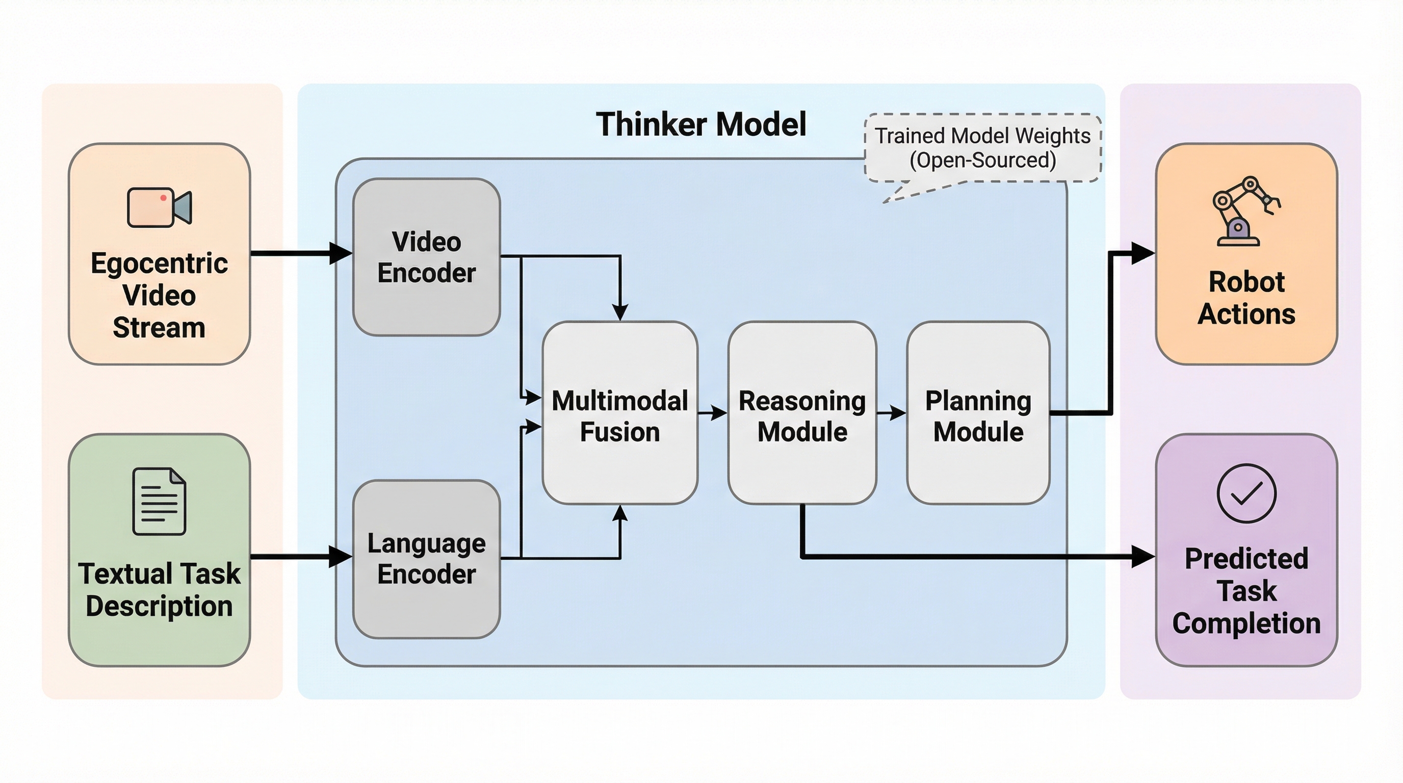 Thinkerは、ロボット工学における視覚と言語の統合を目的とした100億パラメータ規模の基盤モデルであり、従来のモデルが抱えていた三人称視点と一人称視点の混同や、ビデオ終盤情報の見落としといった課題を解決するために開発されました。