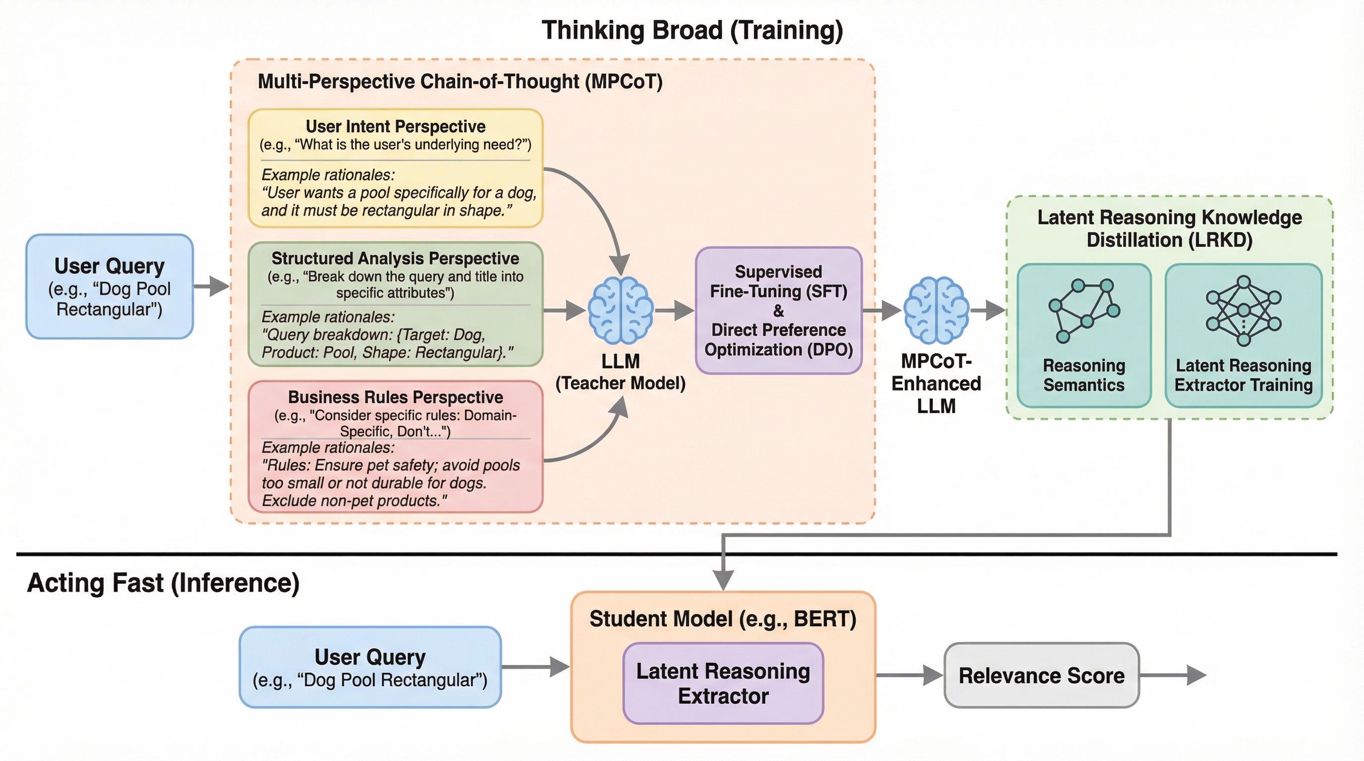 本研究が提案する核心的な解決策は、学習時には「広く深く考え(Thinking Broad)」、推論時には「素早く動く(Acting Fast)」という二段構えの革新的なフレームワークです。具体的には、教師モデルに対して「多角的思考の連鎖(MPCoT)」を導入し、学生モデルに対しては「潜在推論知識蒸留(LRKD)」を適用するという構成になっています。まず、MPCoTは、ECにおける関連性判断が単一の論理では完結しないという事実に着目し、「ユーザー意図の視点」「構造的分析の視点」「ビジネスルールの視点」という三つの異なる角度から推論を生成します。…