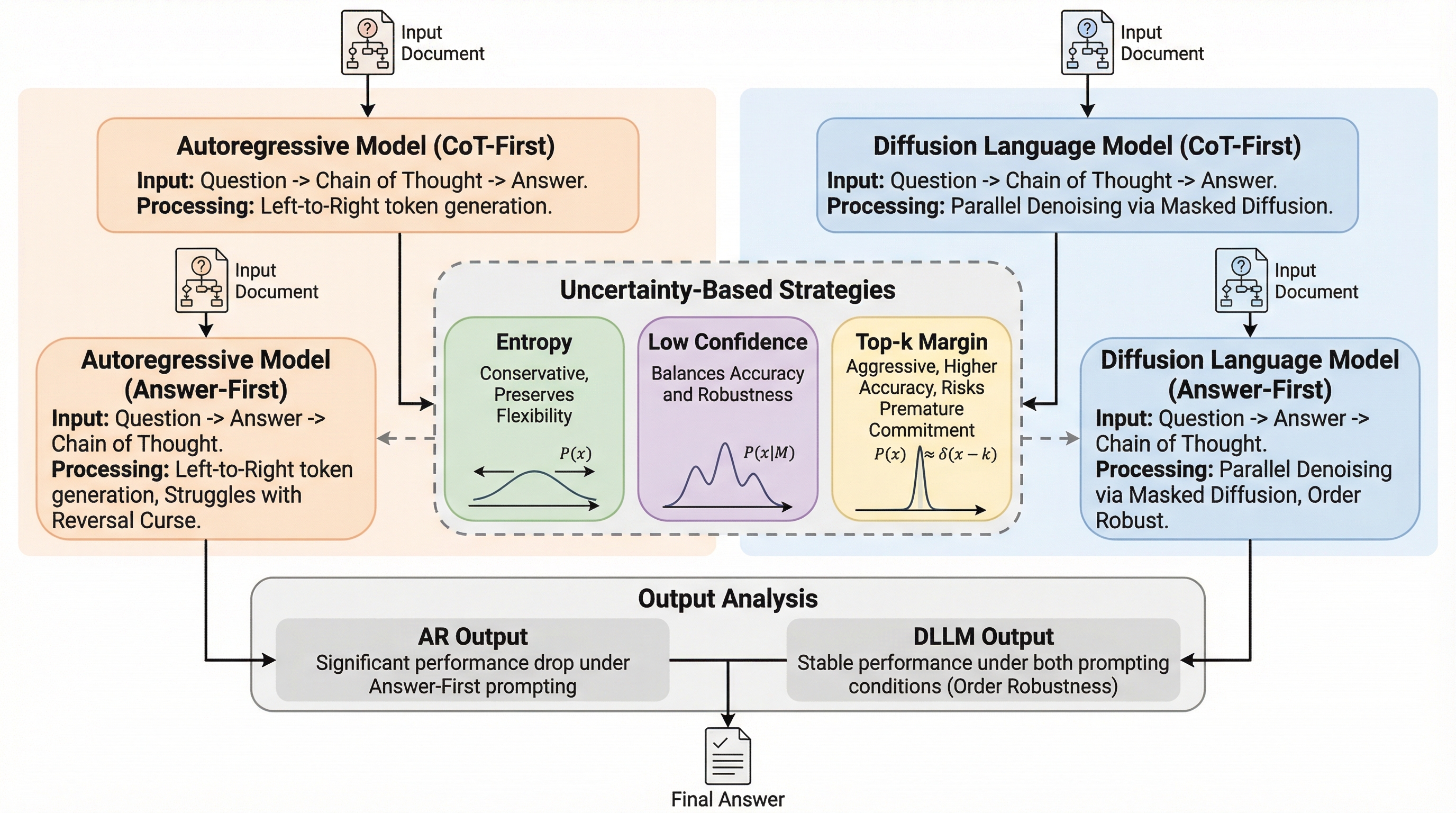 従来の自己回帰型モデルは、回答を推論より先に出力する形式において、十分な思考の前に回答を確定させてしまうため精度が最大67%低下するという構造的な課題がありました。本研究では、マスク拡散言語モデル(MDLM)が、出力の物理的な位置に関わらず確信度の高いトークンから処理することで、回答を先に出力する場合でも高い精度を維持する「順序に対する堅牢性」を持つことを明らかにしました。新ベンチマーク「ReasonOrderQA」を用いた検証により、拡散モデルは単純な推論ステップを複雑な回答よりも先に安定させることで、内部的な推論を先行させてから回答を確定させる仕組みを持っていることが示されました。