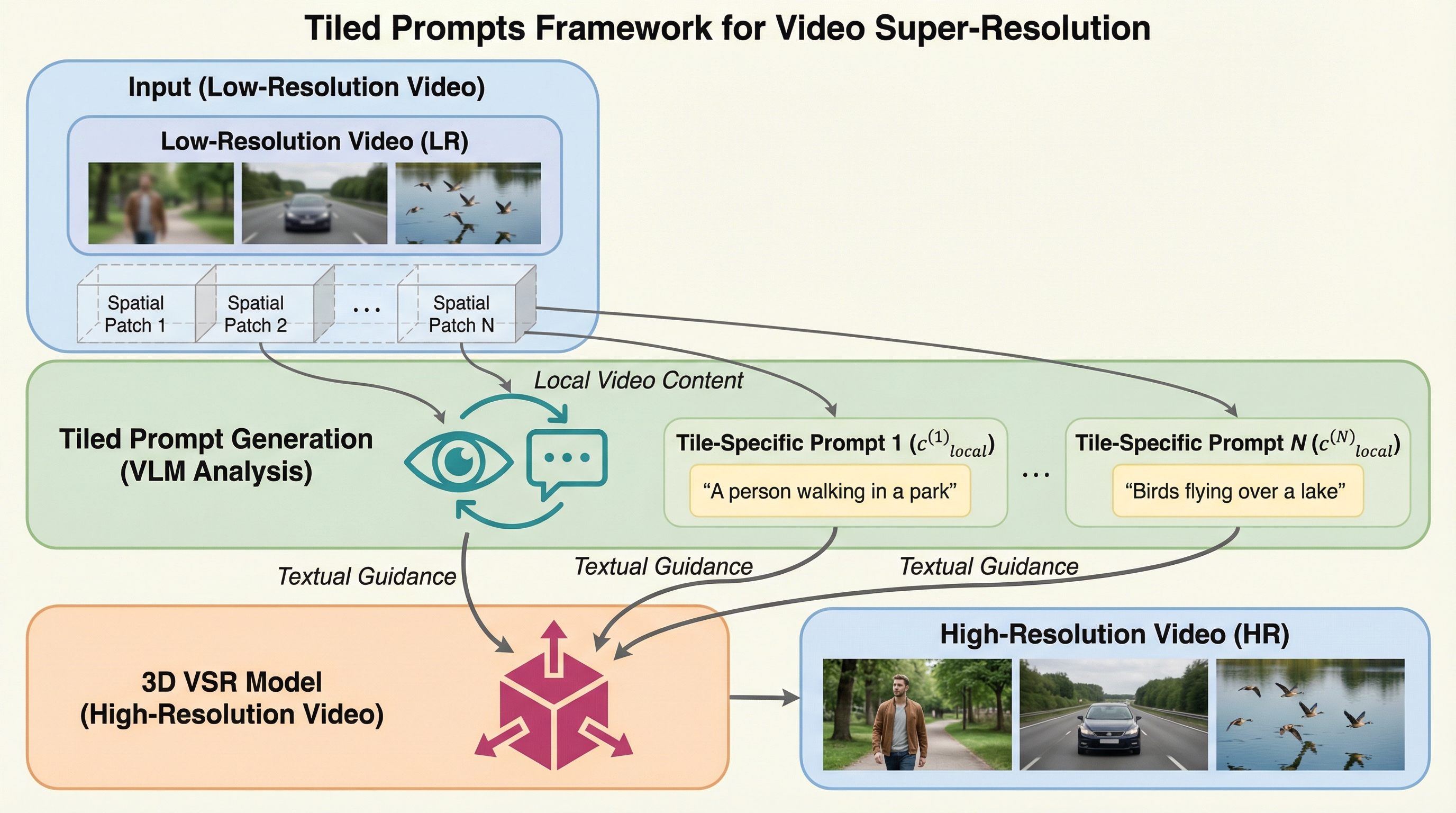 高解像度の画像やビデオの超解像処理において、画像全体を説明する単一のグローバルプロンプトでは、分割された各タイル領域の細部を正確に復元するための情報が不足し、誤った誘導が生じる「プロンプトの不十分さ」という問題が明らかになりました。 本研究が提案する「Tiled Prompts」は、視覚言語モデル(VLM)を活用して各タイル領域ごとに最適化された個別のローカルプロンプトを生成し、領域ごとの意味的な情報を補強することで、文字の再現性や細部の視覚的品質を大幅に向上させる統一的なフレームワークです。 この手法は画像とビデオの両方に適用可能であり、従来の単一プロンプト手法で発生していた情報の欠落(スパース性)や、無関係な情報による誤誘導(ミスガイダンス)を解消し、計算負荷を最小限に抑えつつ、より正確でアーティファクトの少ない高解像度化を実現します。