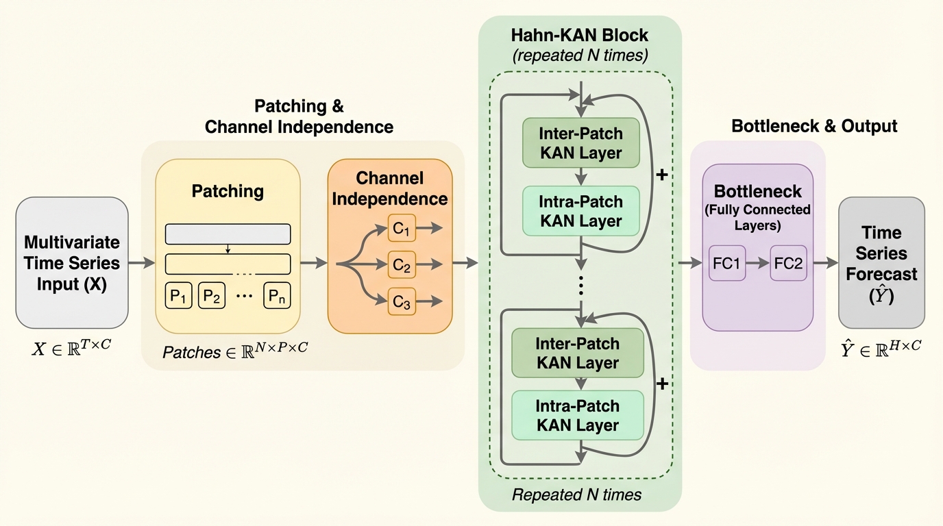 従来の時系列予測で主流だったTransformerの計算量の多さや、MLPが抱える高周波成分の学習の苦手さ(スペクトルバイアス)を解決するため、Hahn多項式を学習可能な活性化関数として組み込んだ新しいネットワーク構造「HaKAN」が開発されました。 このモデルは、データをパッチに分割して処理する階層的な構造を採用しており、パッチ内の局所的な変動とパッチ間の広域的な依存関係を同時に捉えることで、複雑な非線形ダイナミクスを持つ多変量時系列データの正確な予測を可能にしています。 広範なベンチマークデータセットを用いた実験の結果、HaKANは最新のSOTAモデルを一貫して上回る予測精度を達成しており、標準的なKANよりも計算効率が高く、かつ学習された活性化関数を通じて予測プロセスの解釈性も提供する軽量なフレームワークであることが確認されました。