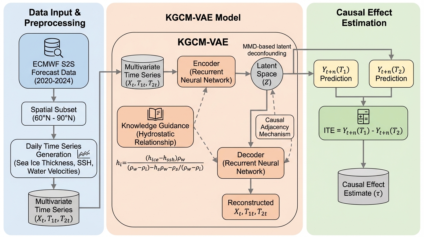 北極海における海氷厚さと海面水位(SSH)の複雑な因果関係を解明するため、物理的知見と変分オートエンコーダーを融合させた新開発のフレームワーク「KGCM-VAE」が提案されました。 このモデルは、流速信号をシグモイド関数で動的に調整する処理生成、潜在空間での分布の偏りを正すMMD、そして物理構造を反映した因果隣接行列によるデコーダー制約を組み合わせることで、観測データからの高精度な因果推論を実現しています。 実際の北極海観測データを用いた検証では、既存の最先端手法を凌駕する推定精度を記録し、特に因果隣接制約と分布調整の相乗効果によって推定誤差を1.88%削減することに成功しており、気候変動予測の精緻化に大きく寄与する成果となっています。