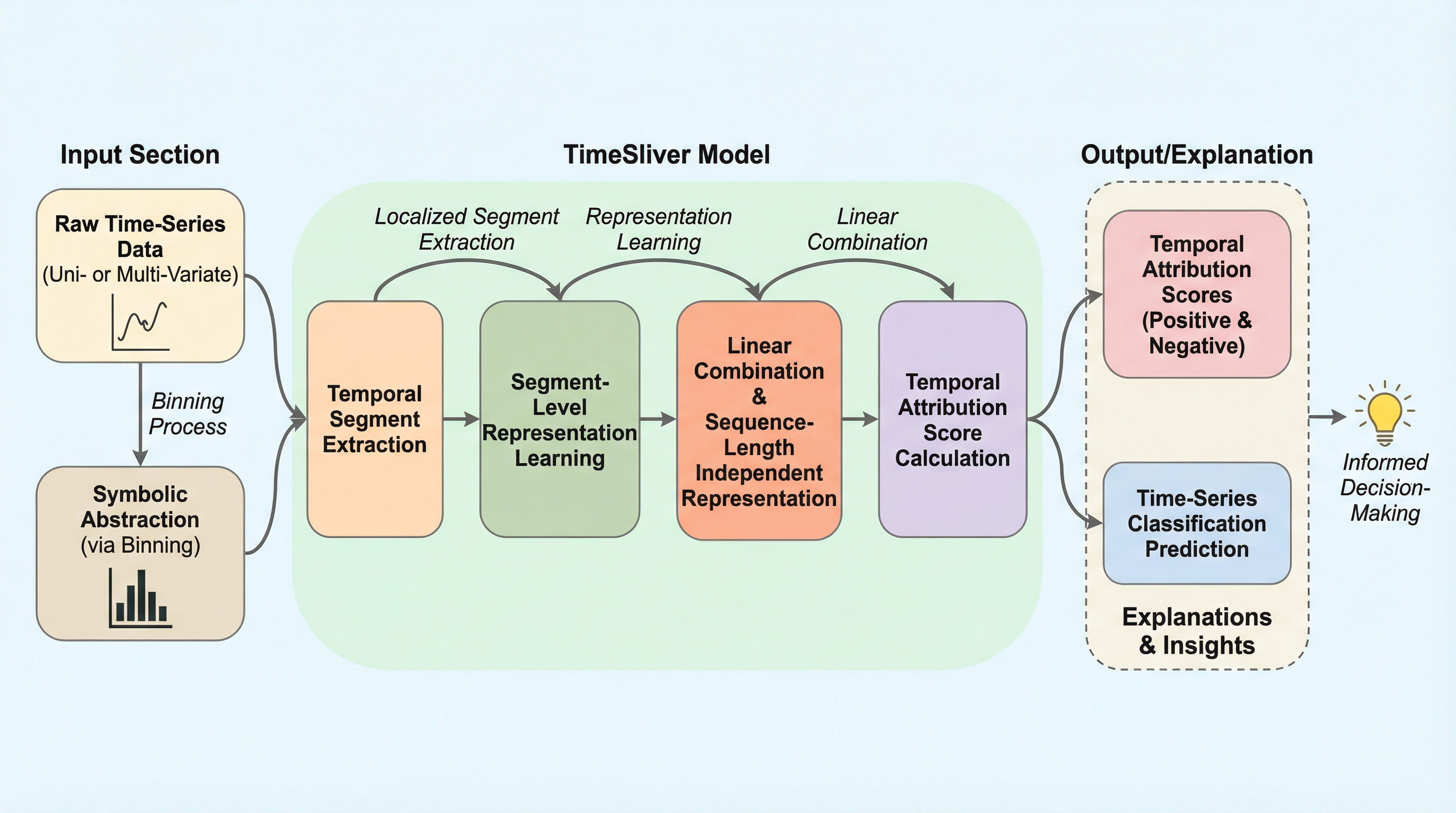TimeSliverは、生の時系列データと記号的な抽象化表現を統合することで、高い予測精度と忠実な説明可能性を両立させた新しい深層学習フレームワークである。1D CNNによる潜在表現とビン化による記号的表現を線形に結合する独自の構造により、各時間ステップが予測に与える正負の影響を明示的に数値化することに成功している。