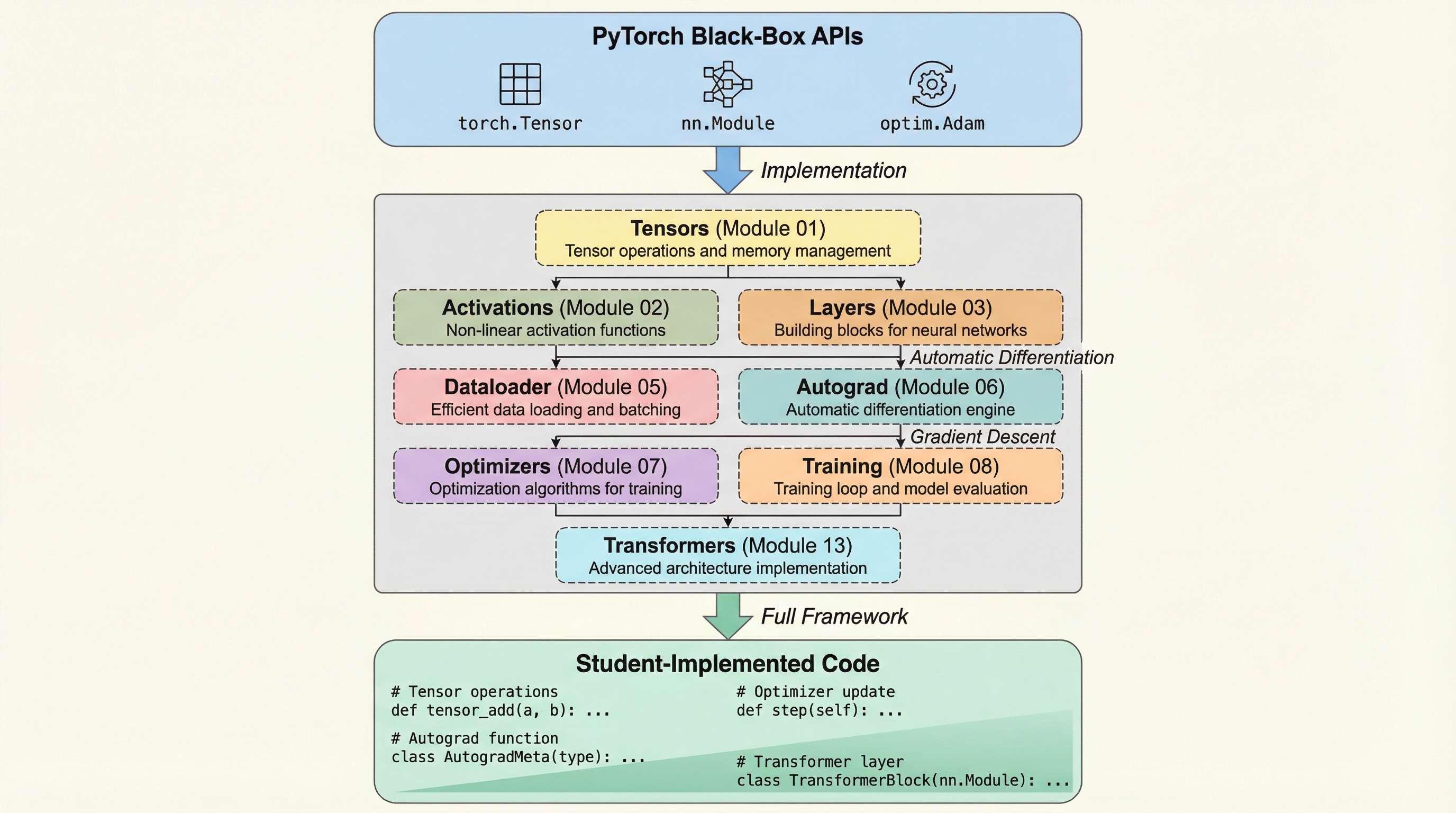 機械学習教育におけるアルゴリズム理論とシステム実行の深刻な乖離を解消するため、20のモジュールで構成される教育カリキュラム「TinyTorch」が提案されました。学生は純粋なPythonのみを用いて、テンソル演算、自動微分、オプティマイザ、トランスフォーマーといったPyTorch互換のコンポーネントをゼロから構築し、全ての操作が自作コードで完結する透明性の高いフレームワークを完成させます。この「構築による検証」アプローチにより、4GBのRAMという最小限のハードウェア環境で、メモリ効率や計算の複雑性、デプロイ時のトレードオフを深く理解する、産業界が求める機械学習システムエンジニアの育成を目指しています。