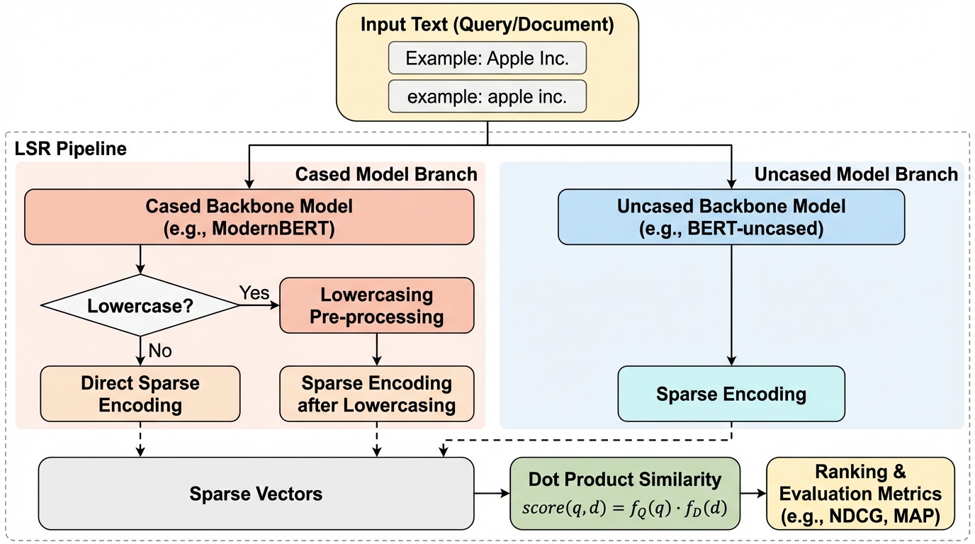 学習型スパース検索(LSR)において、従来主流だった小文字限定(uncased)モデルに対し、最新の言語モデルで一般的な大文字・小文字区別(cased)モデルが与える影響を調査した結果、標準状態では検索精度が大幅に低下することが判明した。 しかし、入力テキストを事前に小文字化する前処理を施すことで、casedモデルであってもuncasedモデルと同等の高い検索精度を達成できることが実証され、ModernBERTなどの最新のcased限定モデルをLSRに統合するための実用的な道筋が示された。 トークンレベルの分析により、小文字化された入力に対してcasedモデルは大文字トークンの出力をほぼ完全に抑制し、実質的にuncasedモデルとして振る舞うことが明らかになり、この挙動が検索性能を回復させる鍵となっていることが確認された。