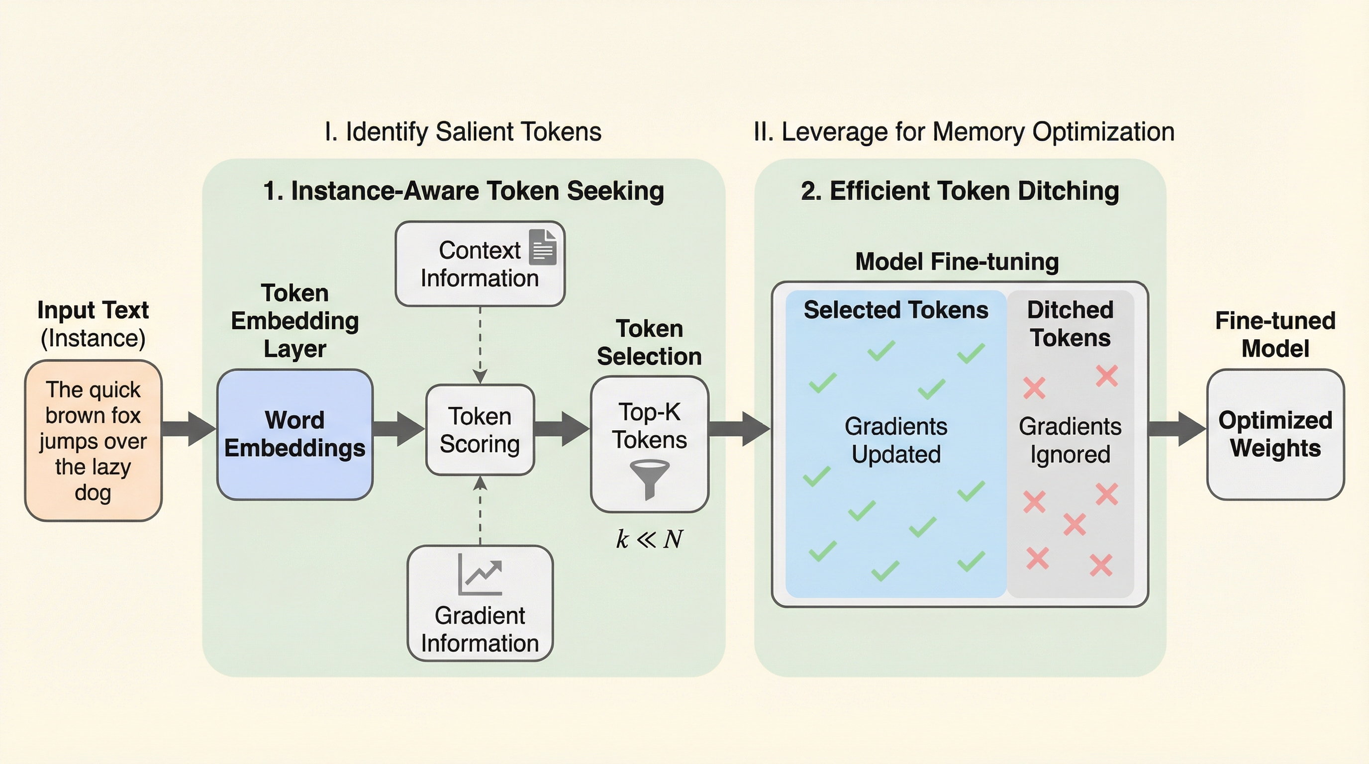本研究では、大規模言語モデルのファインチューニングにおけるメモリ効率と性能のトレードオフを解消するために、新しいプラグイン手法である「TOKENSEEK」を提案しました。この手法の核心は、学習プロセスにおいて「どのトークンが重要か」をインスタンスごとに動的に評価し、重要度の低いトークンのアクティベーションを戦略的に破棄(ditching)することにあります。これにより、モデルのアーキテクチャを変更することなく、大幅なメモリ削減と高い学習性能を同時に達成することを目指しています。 TOKENSEEKは、大きく分けて2つの主要なプロセスで構成されています。第一のプロセスは「インスタンスを考慮したトークンの探索(Instance-Aware Token Seeking)」です。…