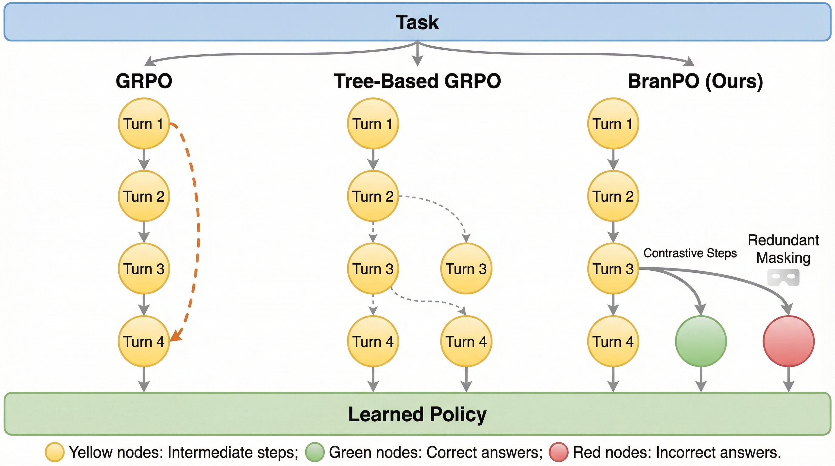 本論文では、価値関数を必要としない新しい方策最適化手法である「Branching Relative Policy Optimization(BranPO)」を提案している。この手法の核心は、軌跡の末尾付近で再サンプリングを行い、共通の接頭辞(プリフィックス)に対して異なる結末(サフィックス)を持つ対照的な分岐を構築することにある。これにより、密な報酬を人手で設定することなく、ステップレベルでの対照的な教師信号を提供することが可能になる。BranPOは、計算コストの高いモンテカルロ推定に頼るのではなく、失敗が発生しやすい決定ポイントを再帰的に切り詰め、結果が異なる分岐のみを抽出して学習に利用する。これにより、エージェントは「何が正解か」だけでなく「何が失敗の原因か」を直接的に比較して学習できるようになる。 また、BranPOは単なるサンプリング手法にとどまらず、学習の効率と安定性を高めるための複数の高度な仕組みを導入している。…