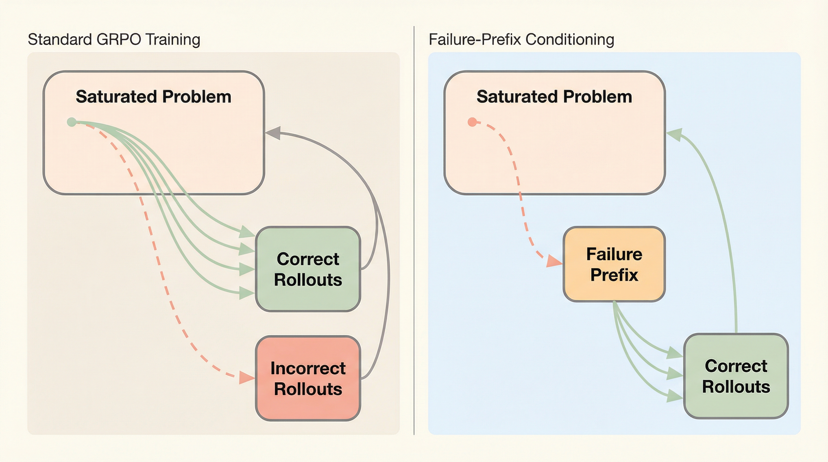 本研究は、飽和した問題から学習信号を効率的に回収するためのシンプルかつ効果的な手法として「失敗プレフィックス条件付け(Failure-Prefix Conditioning)」を提案した。この手法の核心は、元の問題文から推論を開始するのではなく、モデルが過去に生成した「稀な誤答」の冒頭部分(プレフィックス)を問題文の直後に結合し、そこから推論を継続させる点にある。これにより、モデルは意図的に失敗しやすい推論状態に置かれ、そこから正解にたどり着くための探索を強制される。このアプローチは、探索の範囲を推論空間内の不確実性が高い領域、すなわち失敗が発生しやすい領域へと再配分する役割を果たす。 具体的には、まず飽和した問題に対してモデルが生成した稀な誤答を特定し、それを複数の長さの断片に分割する。次に、それぞれの断片をプレフィックスとして与えた場合の正解率を測定し、学習信号が最大化されるターゲット正解率(例えば0.…