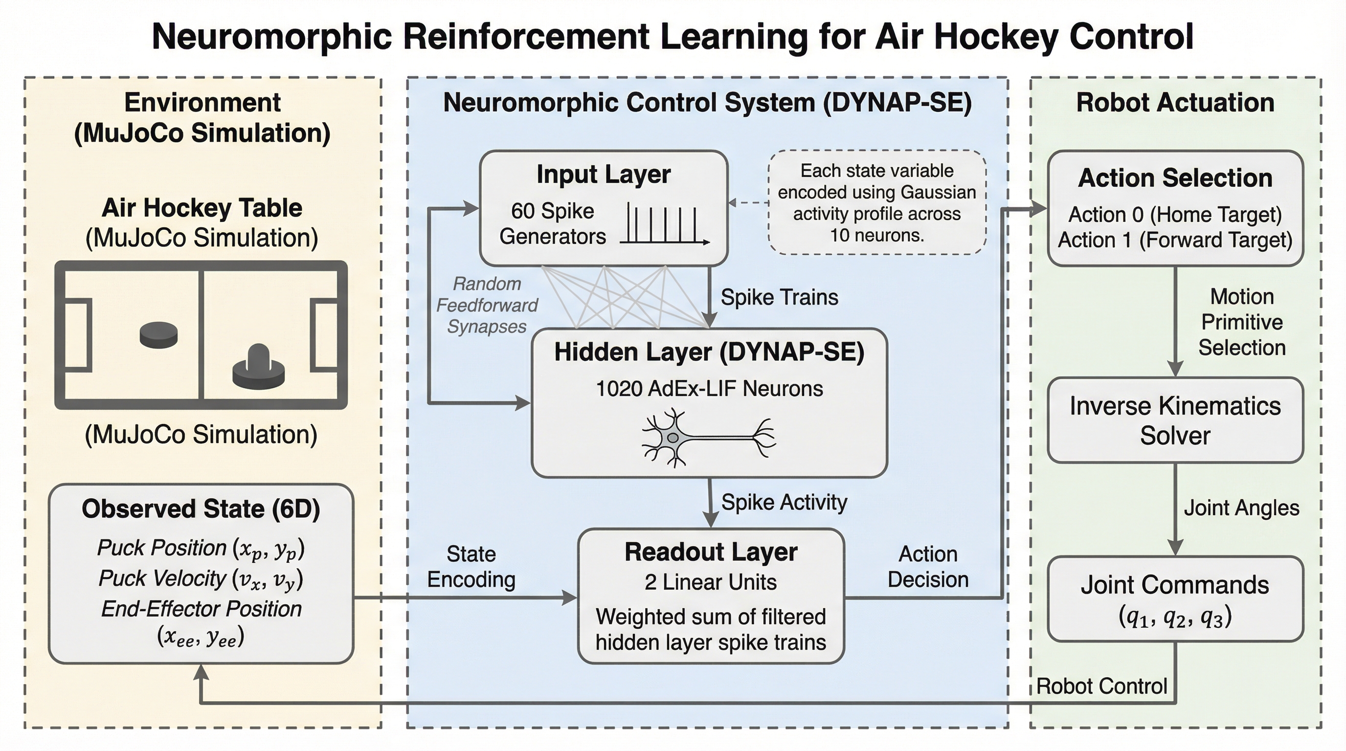 本研究は、ミリ秒単位の判断が求められる高速なエアホッケー競技において、アナログとデジタルの混合信号を扱う「DYNAP-SE」ニューロモーフィック・プロセッサを用いたスパイキングニューラルネットワーク(SNN)による制御を実現しました。 ハードウェアと学習アルゴリズムを共同設計し、局所的な学習規則である「e-prop」を活用することで、非常に少ない試行回数かつ低消費電力で、高速に移動するパックを正確に迎撃する強化学習プロセスを構築することに成功しています。 検証の結果、時速1.0から1.5メートルの速度で移動するパックに対し、2000エピソード以内の学習で96%から98%という極めて高い成功率を達成し、従来の生物学的アプローチと比較して10分の1のニューロン数で動作することを証明しました。