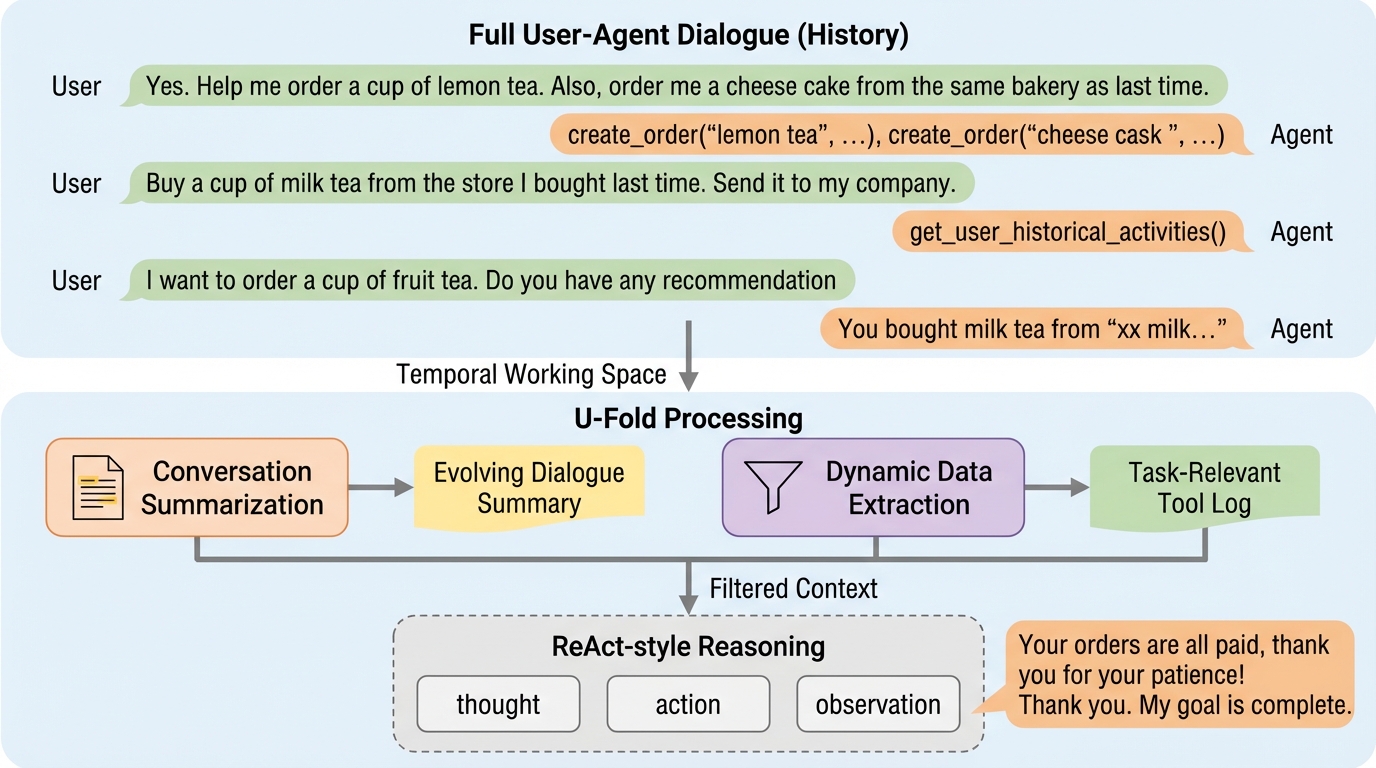 本研究では、ユーザー中心のタスクに特化した動的なコンテキストフォールディングフレームワークである「U-Fold」を提案した。U-Foldの最大の特徴は、静的な要約に頼るのではなく、ユーザーとエージェントの完全な対話履歴およびツール呼び出し履歴をバックグラウンドで保持し続ける点にある。その上で、各ターンにおいて、現在のユーザーの意図に合わせたコンパクトな作業用コンテキストを動的に構築する。これにより、情報の冗長性を大幅に削減しながら、ユーザー中心のタスクに不可欠な詳細な制約や中間的な事実を保存することが可能になる。 U-Foldは、二つの軽量なコアコンポーネントによって構成されている。一つ目は「対話要約モジュール」であり、これは対話の進化を追跡し、ユーザーの意図の最新の見解を維持する役割を担う。…