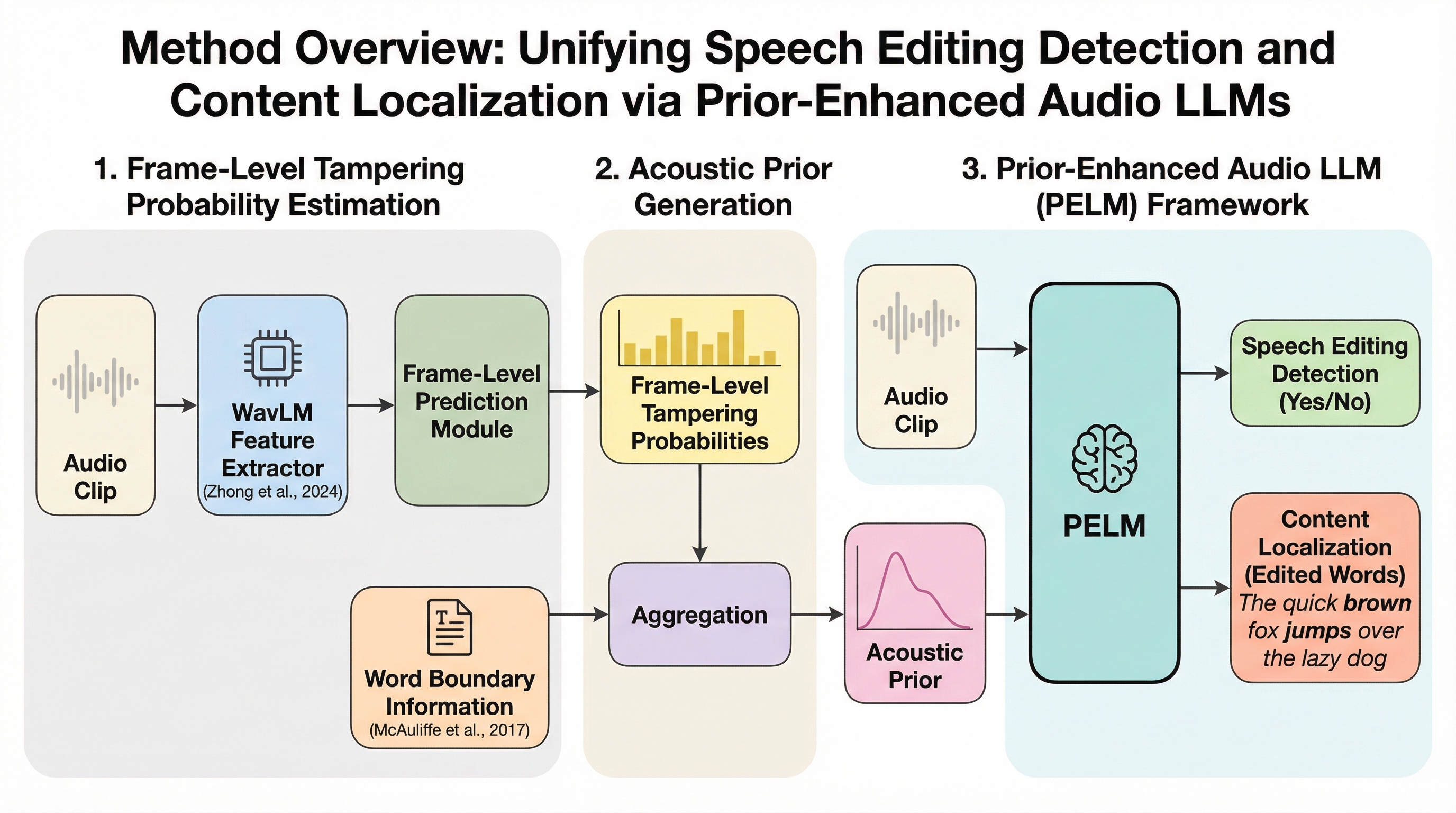従来の音声編集検出は手動編集による継ぎ目の痕跡に依存していたが、最新のニューラル音声編集技術が生成する自然な音響遷移の検出は困難であったため、大規模言語モデルを活用して精密な意味改ざん論理を駆動し、複数の高度な生成手法を統合した高品質な二言語データセット「AiEdit」を構築した。 この課題に対し、音声編集の検出と改ざん箇所の特定をオーディオ質問回答タスクとして定式化し、これらを統一的に処理する初の大型モデルフレームワーク「PELM」を提案し、単語レベルの確率的事前知識の導入と音響的一貫性知覚損失の設計によって、既存モデルの課題であった偽造バイアスと意味優先バイアスを抑制した。 広範な検証の結果、提案手法であるPELMは既存の最高水準の手法を大幅に上回る性能を示し、HumanEditデータセットで0.57%、AiEditデータセットの特定タスクで9.28%という極めて低い等価エラー率(EER)を達成し、局所的な音響異常を正確に捉える能力を証明した。