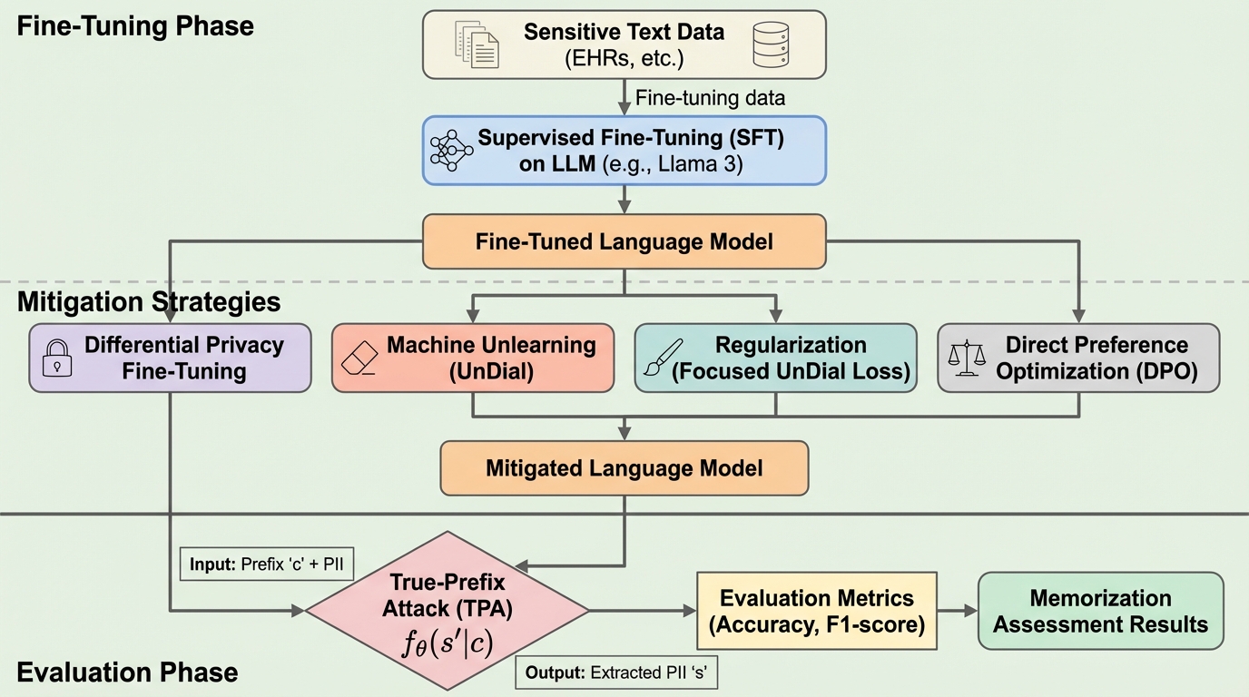 大規模言語モデル(LLM)を特定のデータセットで微調整する際、学習の目的(ターゲット)には含まれず、入力データにのみ存在する個人識別情報(PII)が意図せず記憶され、外部からの攻撃によって抽出可能になるリスクを、合成データと実世界の医療データを用いて体系的に明らかにした。 実験の結果、情報の出現頻度と記憶のしやすさには決定係数 0.237 という極めて弱い相関しかなく、単純な重複回数よりもデータの文脈や言語、モデルの規模、タスクの種類が記憶の度合いに複雑かつ重大な影響を与えることが判明し、たった一度の出現でも機密情報が漏洩する危険性が示された。 差分プライバシー(DP)や機械アンラーニング、DPOなどの対策を比較した結果、事後学習手法が実用的な性能とプライバシーのバランスにおいて優れた堅牢性を示したが、完全な防御は依然として困難であり、医療分野のような機密性の高い領域での安全なモデル展開には、より堅牢でスケーラブルな技術の必要性が強調された。
