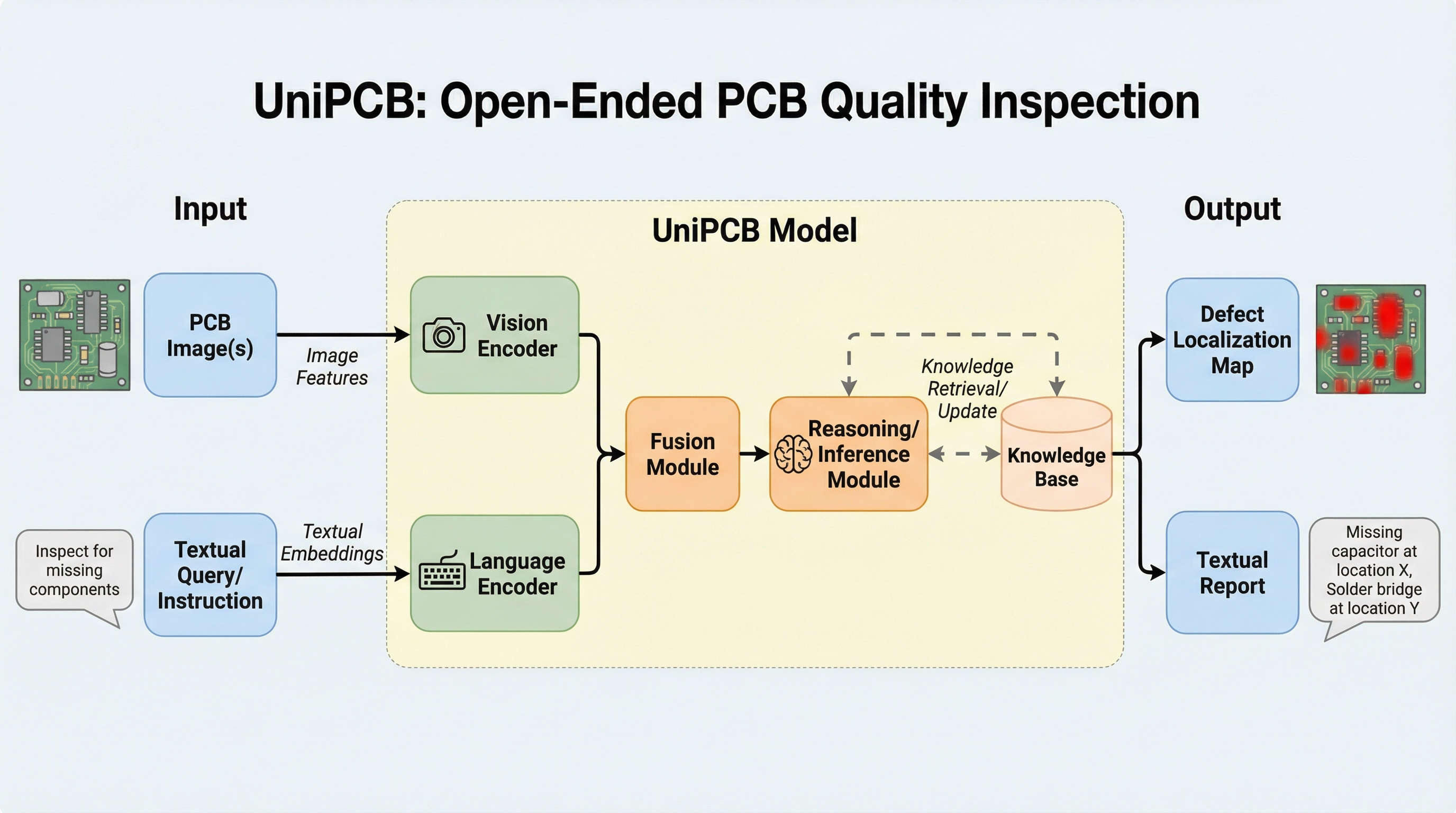 UniPCBは、プリント基板(PCB)の品質検査を目的とした世界初の統一的な視覚言語ベンチマークであり、6,000枚以上の画像と23,000件を超える高品質な多対話形式の質問回答ペアを提供することで、複雑な工業検査におけるマルチモーダルモデルの性能を厳密に評価する。 従来の汎用モデルが苦手とする高密度な部品配置や微細な欠陥の特定、専門知識を要するリスク分析などの課題に対し、人間の専門家の学習過程を模倣した3段階のカリキュラム学習を導入した新モデル「PCB-GPT」を提案し、既存の強力な競合モデルと比較して欠陥の局所化精度を2倍以上に向上させた。 この研究は、断片化されていたPCBデータセットを統合し、構造的欠陥やはんだ付け不良など7つのカテゴリと1,000以上の部品インスタンスを網羅する統一的な分類体系を確立することで、工業分野におけるマルチモーダル大規模言語モデル(MLLM)の実用的な意思決定支援の基盤を築いている。